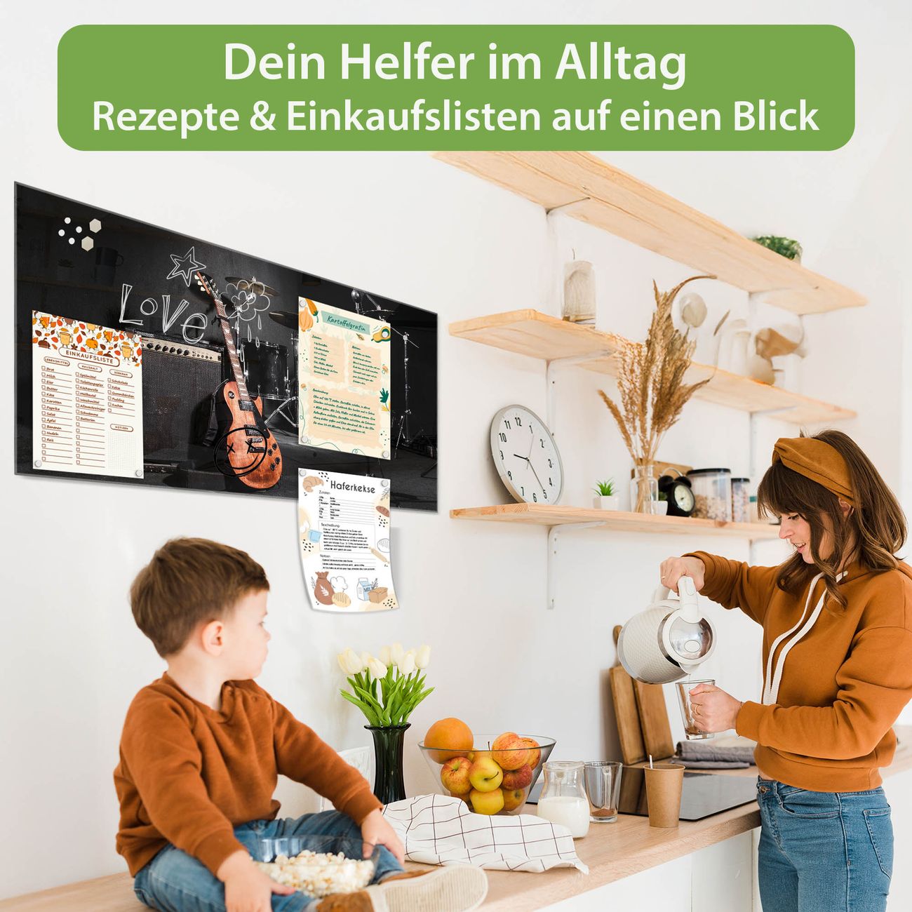 Ein Stück Design, das Ihren Alltag organisiert. Schreiben, heften, inspirieren - alles an einem Ort. Qualität, die man spürt. Montage leicht gemacht. Handwerk mit Herz - veredelt in Sachsen. Einzigartiges Design mit Motiv Motiv Jam Session Beschreibbare Glasoberfläche, leicht zu reinigen Starke Magnetkraft durch Stahlrückwand Inklusive 4 Neodym-Magneten Flexible Montageoptionen Handveredelt in Sachsen - Qualität, die bleibt