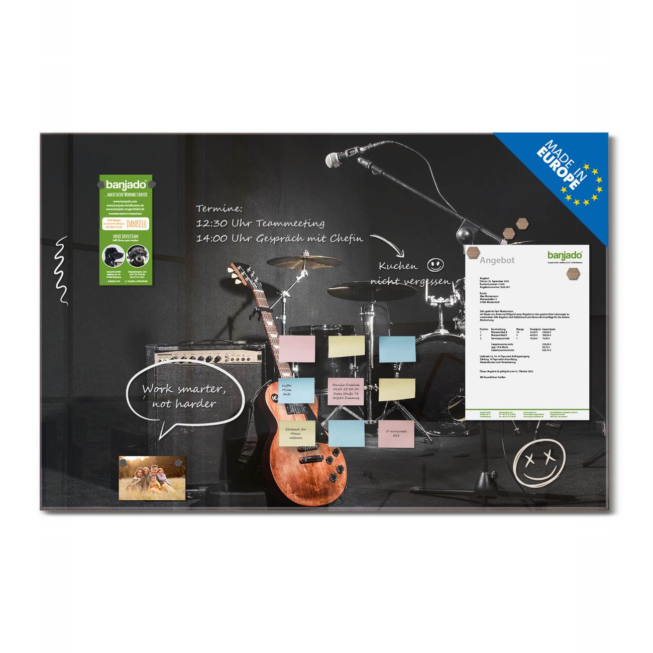 Ein Stück Design, das Ihren Alltag organisiert. Schreiben, heften, inspirieren - alles an einem Ort. Qualität, die man spürt. Montage leicht gemacht. Handwerk mit Herz - veredelt in Sachsen. Einzigartiges Design mit Motiv Motiv Jam Session Beschreibbare Glasoberfläche, leicht zu reinigen Starke Magnetkraft durch Stahlrückwand Inklusive 4 Neodym-Magneten Flexible Montageoptionen Handveredelt in Sachsen - Qualität, die bleibt