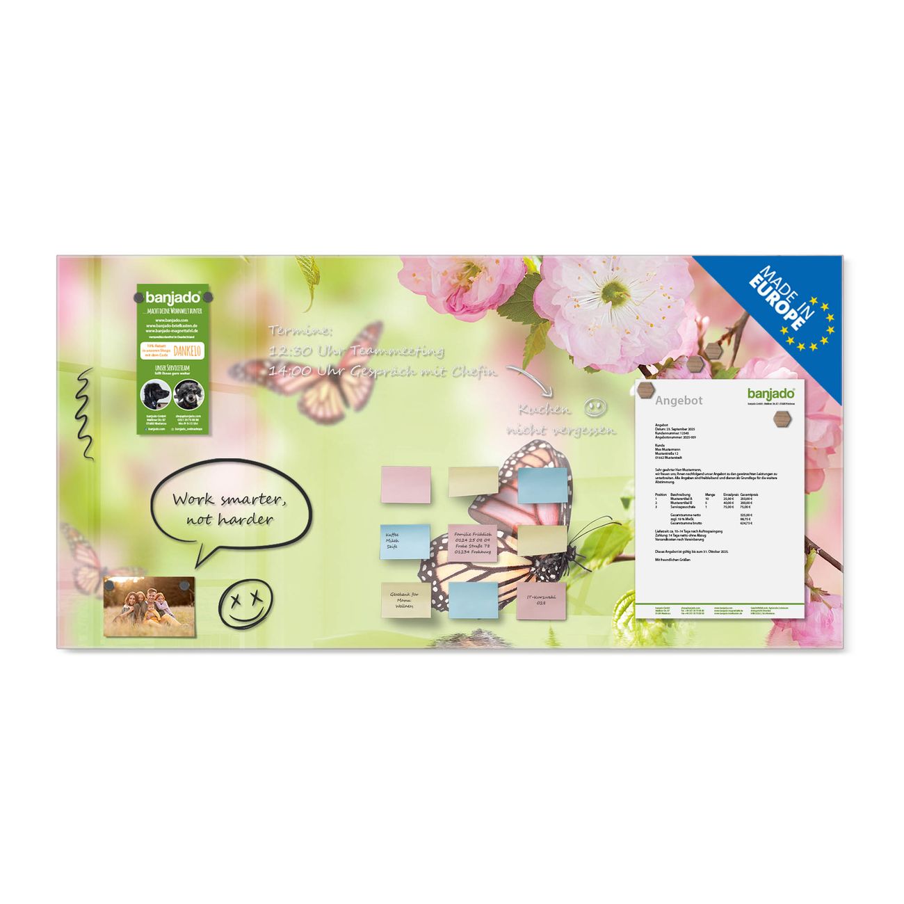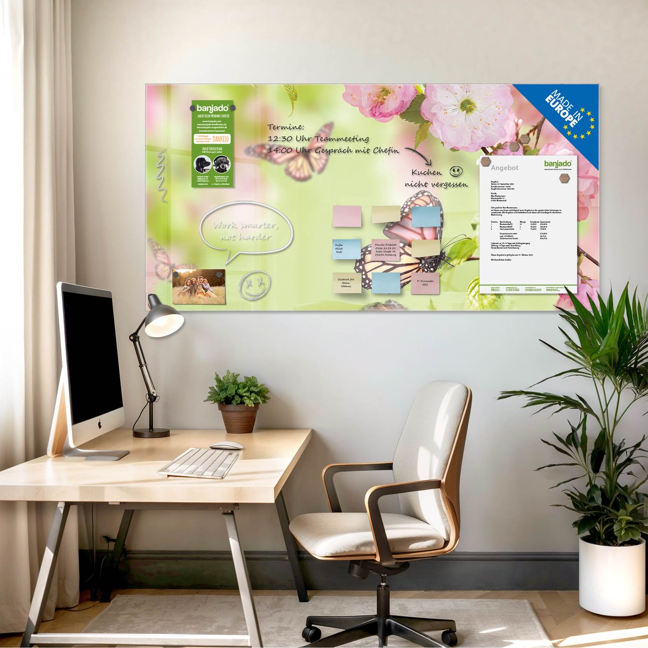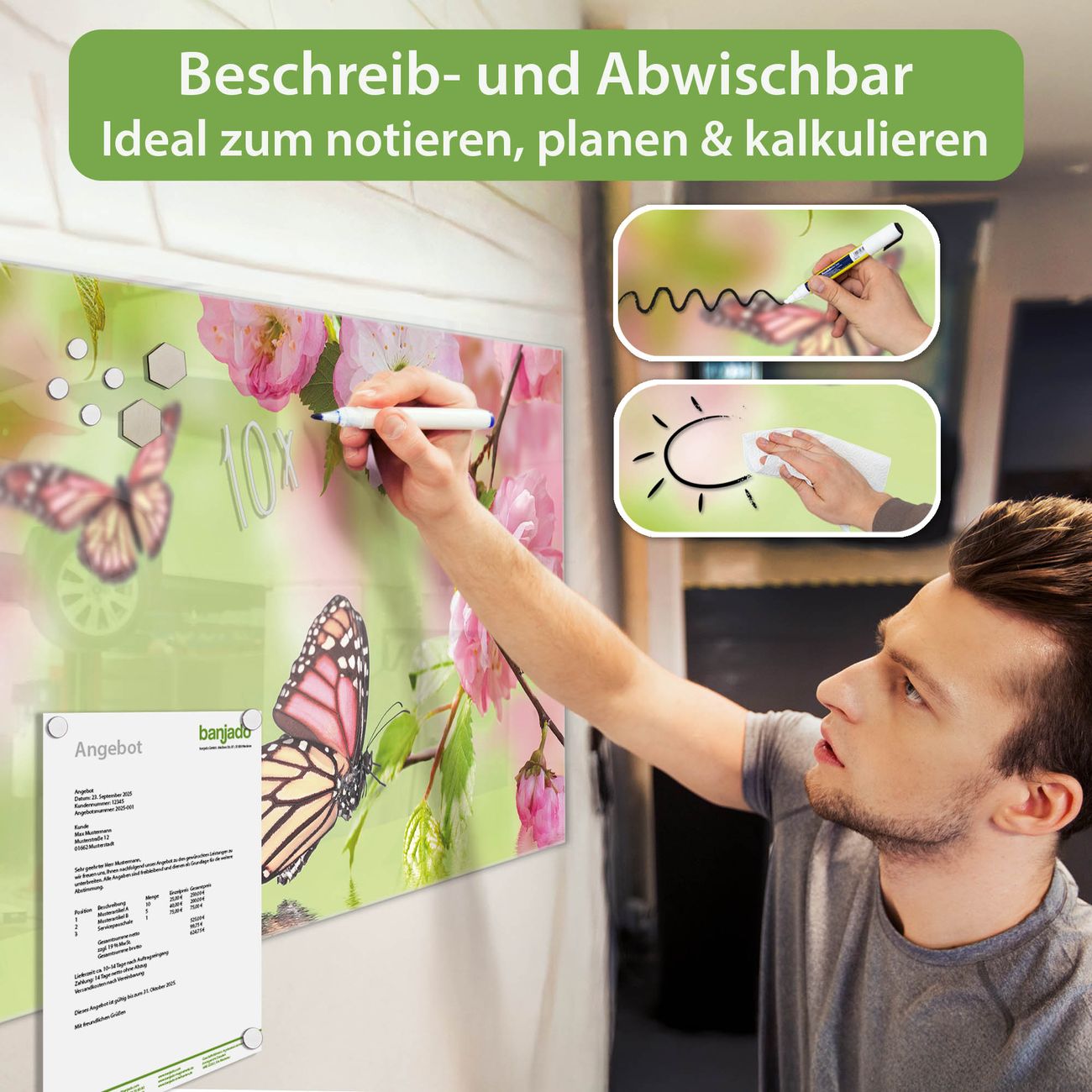 Jede Glas Magnettafel wird in unserer Werkstatt von Hand gefertigt und sorgfältig geprüft. So erhalten Sie ein echtes Qualitätsprodukt, das Funktion und Ästhetik perfekt vereint.?? Warum banjado?