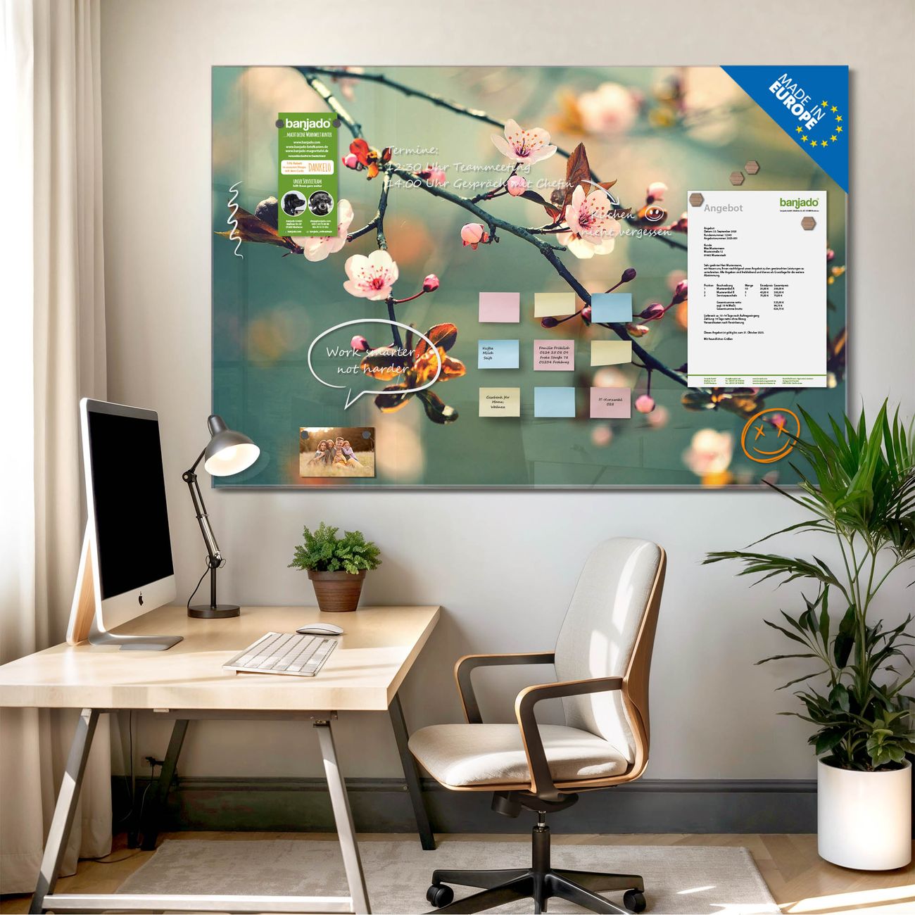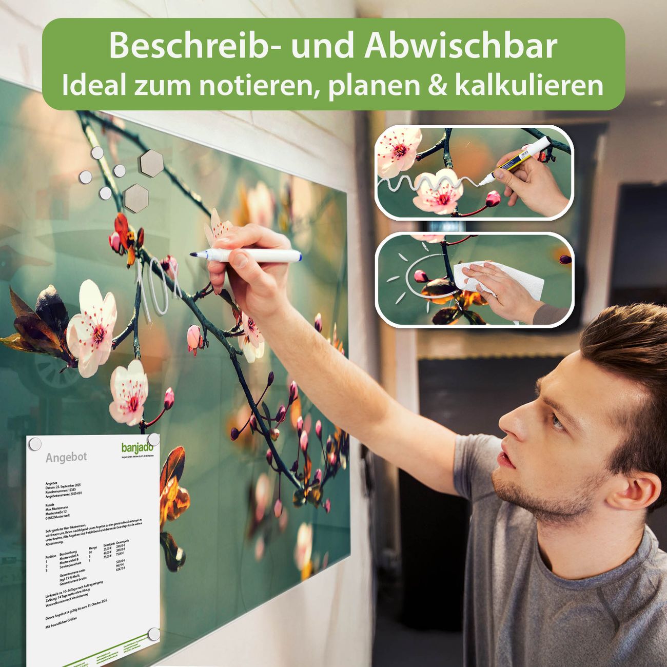 Jede Glas Magnettafel wird in unserer Werkstatt von Hand gefertigt und sorgfältig geprüft. So erhalten Sie ein echtes Qualitätsprodukt, das Funktion und Ästhetik perfekt vereint.?? Warum banjado?