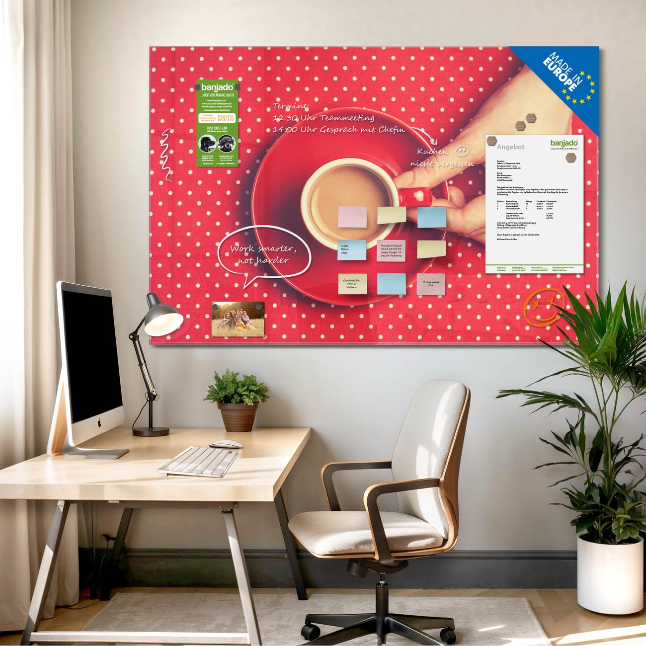 Die banjado Glas Magnettafel mit dem Motiv Motiv Kaffee Rot Weiss verbindet Funktionalität mit Stil. Sie ersetzt das Zettelchaos durch klare Strukturen und bringt dabei eine warme, natürliche Atmosphäre in Ihr Zuhause. Ob im Büro, in der Küche oder im Eingangsbereich - dieses Design-Board zieht Blicke an und sorgt für Ordnung mit Charakter.