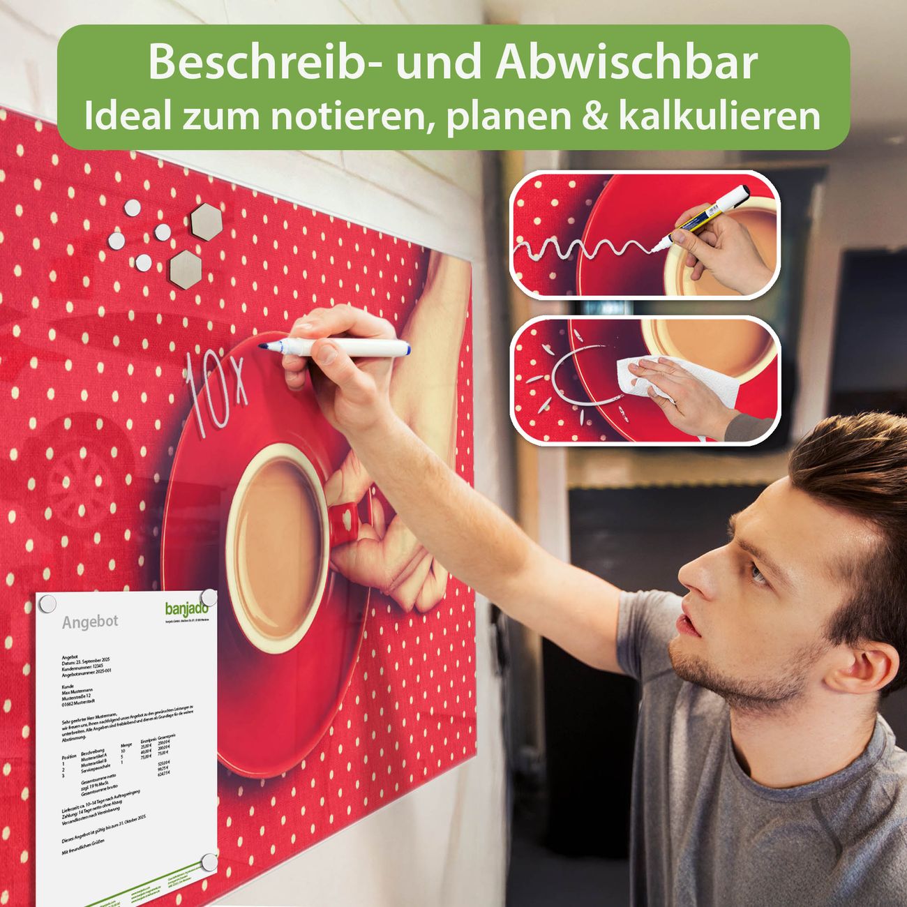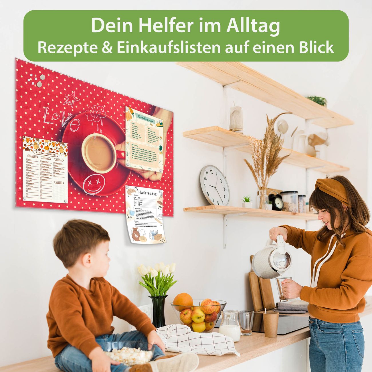 Ein Stück Design, das Ihren Alltag organisiert. Schreiben, heften, inspirieren - alles an einem Ort. Qualität, die man spürt. Montage leicht gemacht. Handwerk mit Herz - veredelt in Sachsen. Einzigartiges Design mit Motiv Motiv Kaffee Rot Weiss Beschreibbare Glasoberfläche, leicht zu reinigen Starke Magnetkraft durch Stahlrückwand Inklusive 4 Neodym-Magneten Flexible Montageoptionen Handveredelt in Sachsen - Qualität, die bleibt