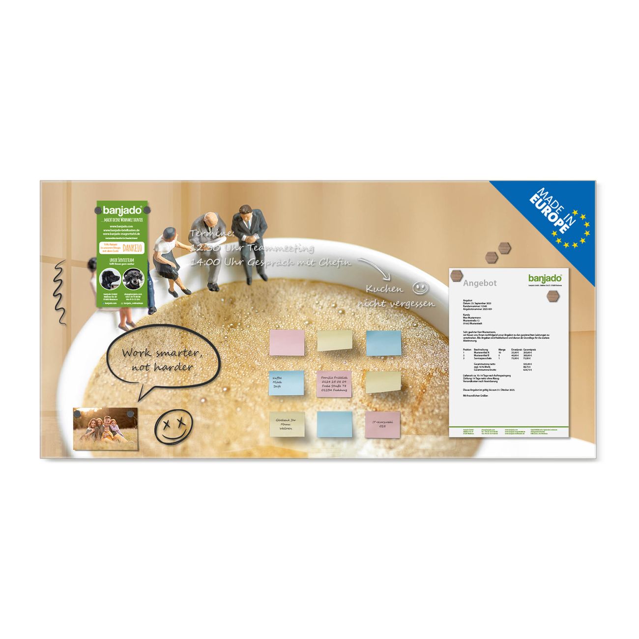 Ein Stück Design, das Ihren Alltag organisiert. Schreiben, heften, inspirieren - alles an einem Ort. Qualität, die man spürt. Montage leicht gemacht. Handwerk mit Herz - veredelt in Sachsen. Einzigartiges Design mit Motiv Motiv Kaffeepause Beschreibbare Glasoberfläche, leicht zu reinigen Starke Magnetkraft durch Stahlrückwand Inklusive 4 Neodym-Magneten Flexible Montageoptionen Handveredelt in Sachsen - Qualität, die bleibt