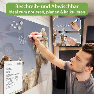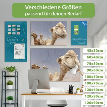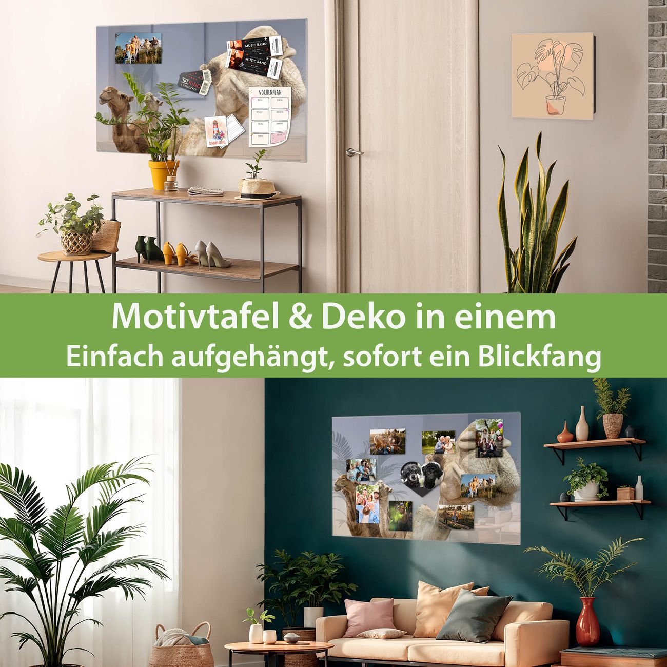 Die banjado Glas Magnettafel mit dem Motiv Motiv Kamele verbindet Funktionalität mit Stil. Sie ersetzt das Zettelchaos durch klare Strukturen und bringt dabei eine warme, natürliche Atmosphäre in Ihr Zuhause. Ob im Büro, in der Küche oder im Eingangsbereich - dieses Design-Board zieht Blicke an und sorgt für Ordnung mit Charakter.