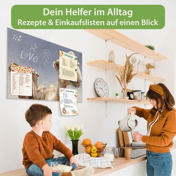 Auf der glatten Glasoberfläche lassen sich Termine, Rezepte oder Notizen ganz einfach mit Kreidestiften festhalten und rückstandslos entfernen. Starke Neodym-Magnete halten Ihre wichtigsten Erinnerungen sicher an Ort und Stelle. So entsteht Ihre ganz persönliche Ideenwand - jeden Tag neu.