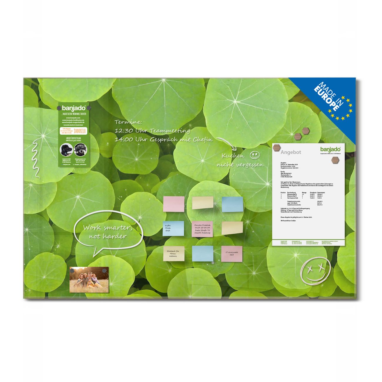 Jede Glas Magnettafel wird in unserer Werkstatt von Hand gefertigt und sorgfältig geprüft. So erhalten Sie ein echtes Qualitätsprodukt, das Funktion und Ästhetik perfekt vereint.?? Warum banjado?