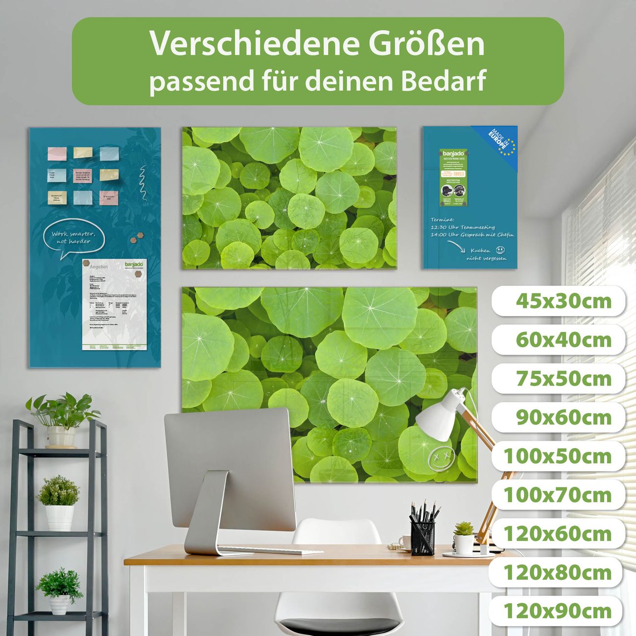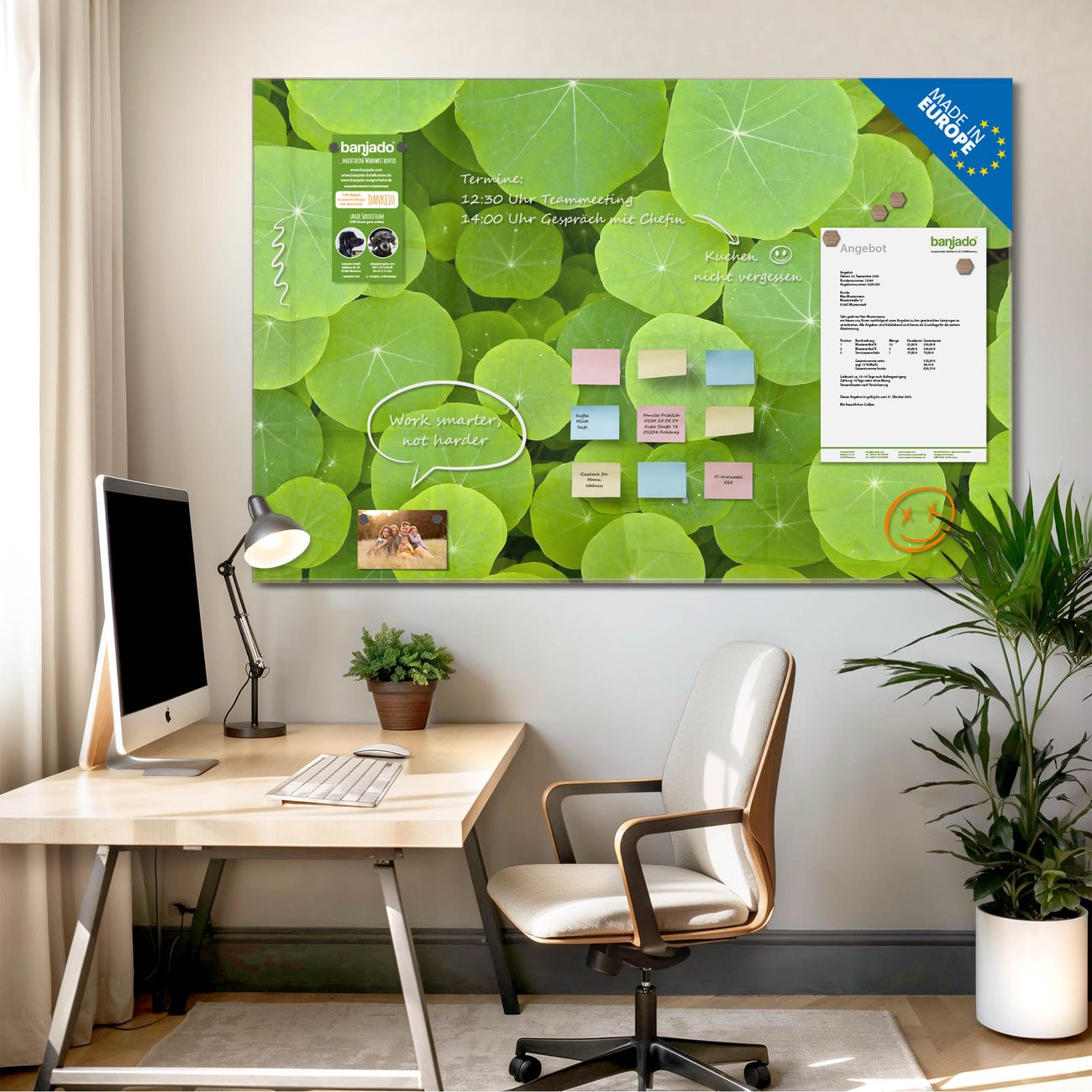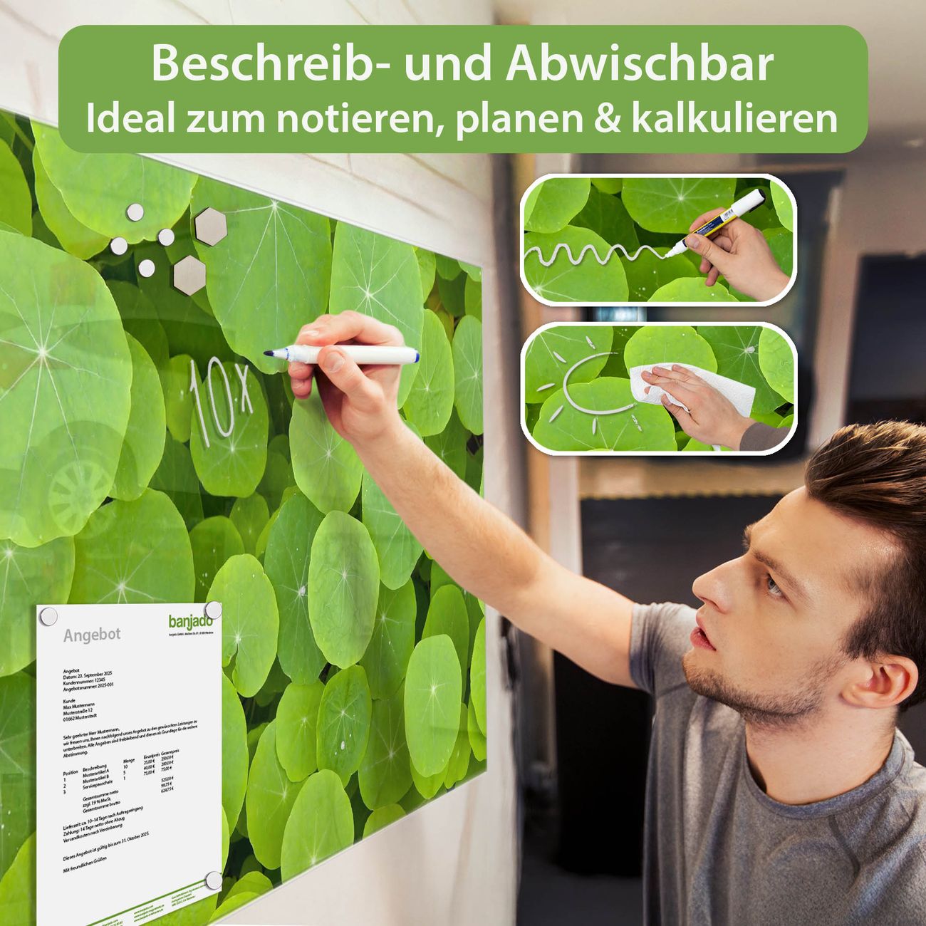 Die banjado Glas Magnettafel mit dem Motiv Motiv Kapuzinerkresse verbindet Funktionalität mit Stil. Sie ersetzt das Zettelchaos durch klare Strukturen und bringt dabei eine warme, natürliche Atmosphäre in Ihr Zuhause. Ob im Büro, in der Küche oder im Eingangsbereich - dieses Design-Board zieht Blicke an und sorgt für Ordnung mit Charakter.