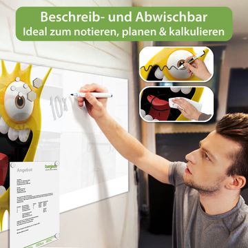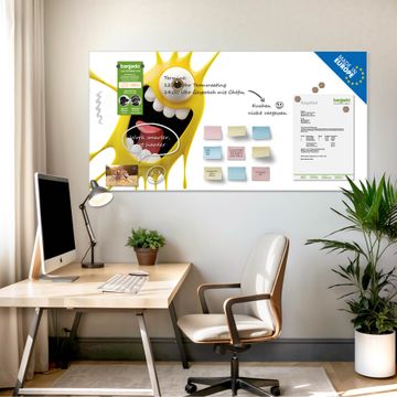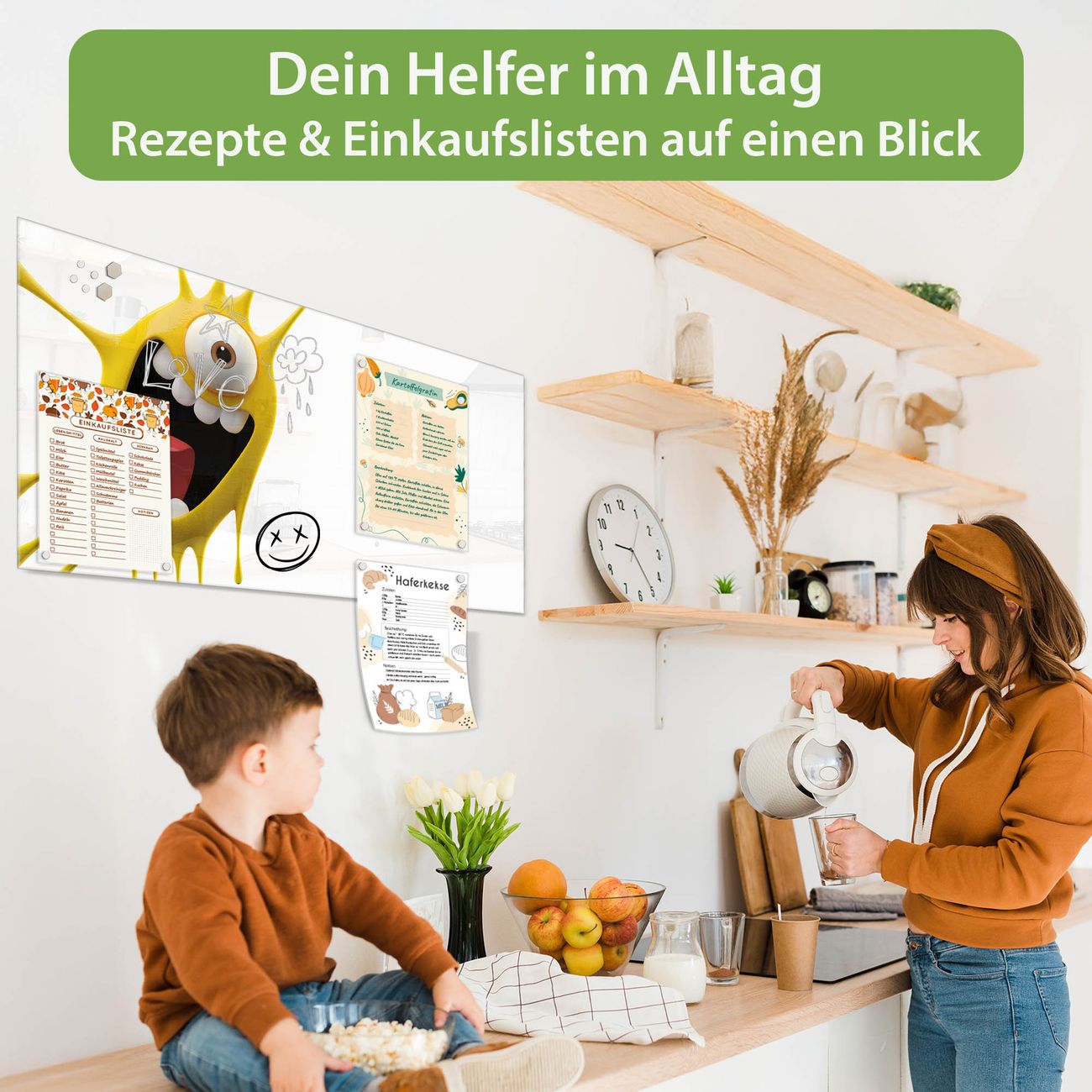 Auf der glatten Glasoberfläche lassen sich Termine, Rezepte oder Notizen ganz einfach mit Kreidestiften festhalten und rückstandslos entfernen. Starke Neodym-Magnete halten Ihre wichtigsten Erinnerungen sicher an Ort und Stelle. So entsteht Ihre ganz persönliche Ideenwand - jeden Tag neu.