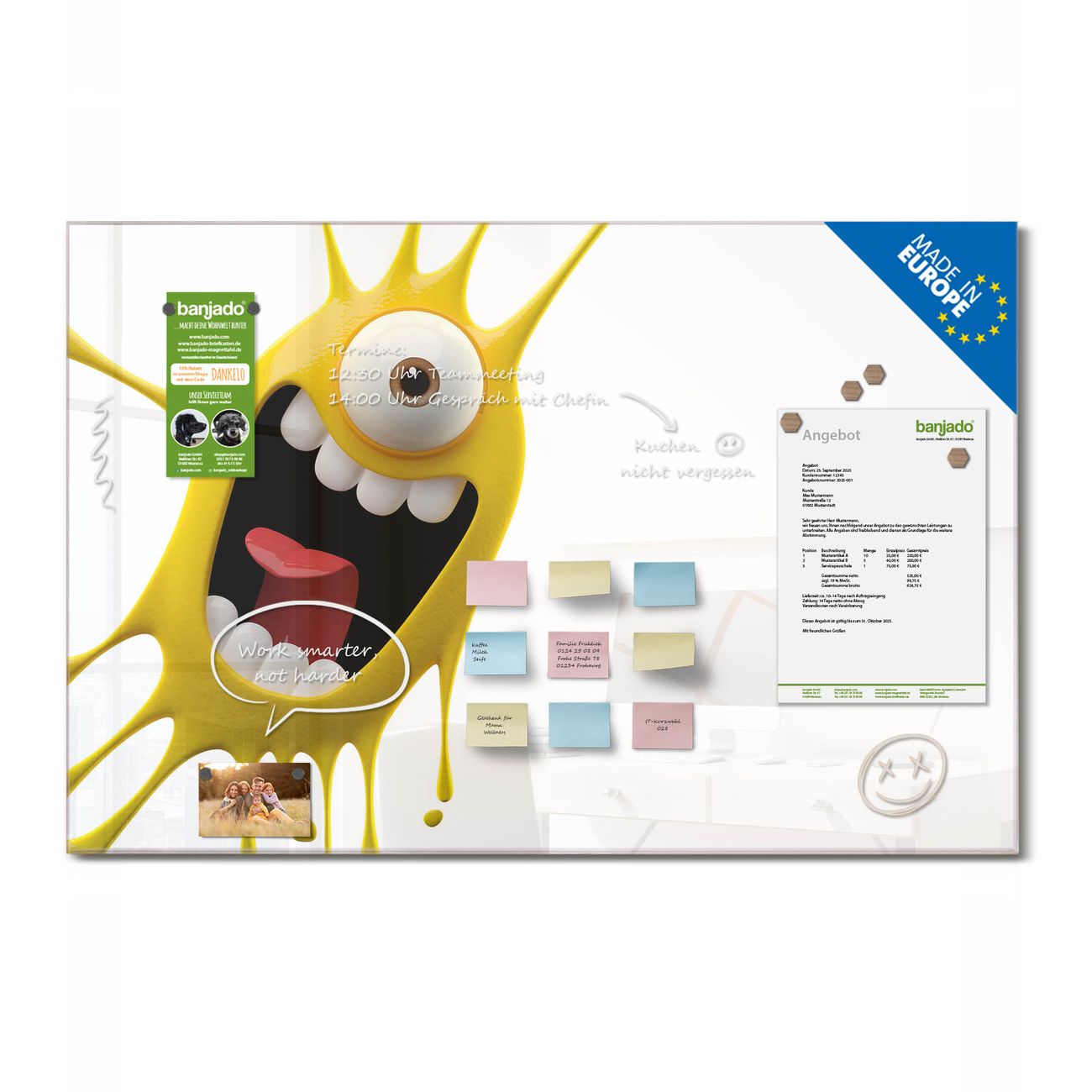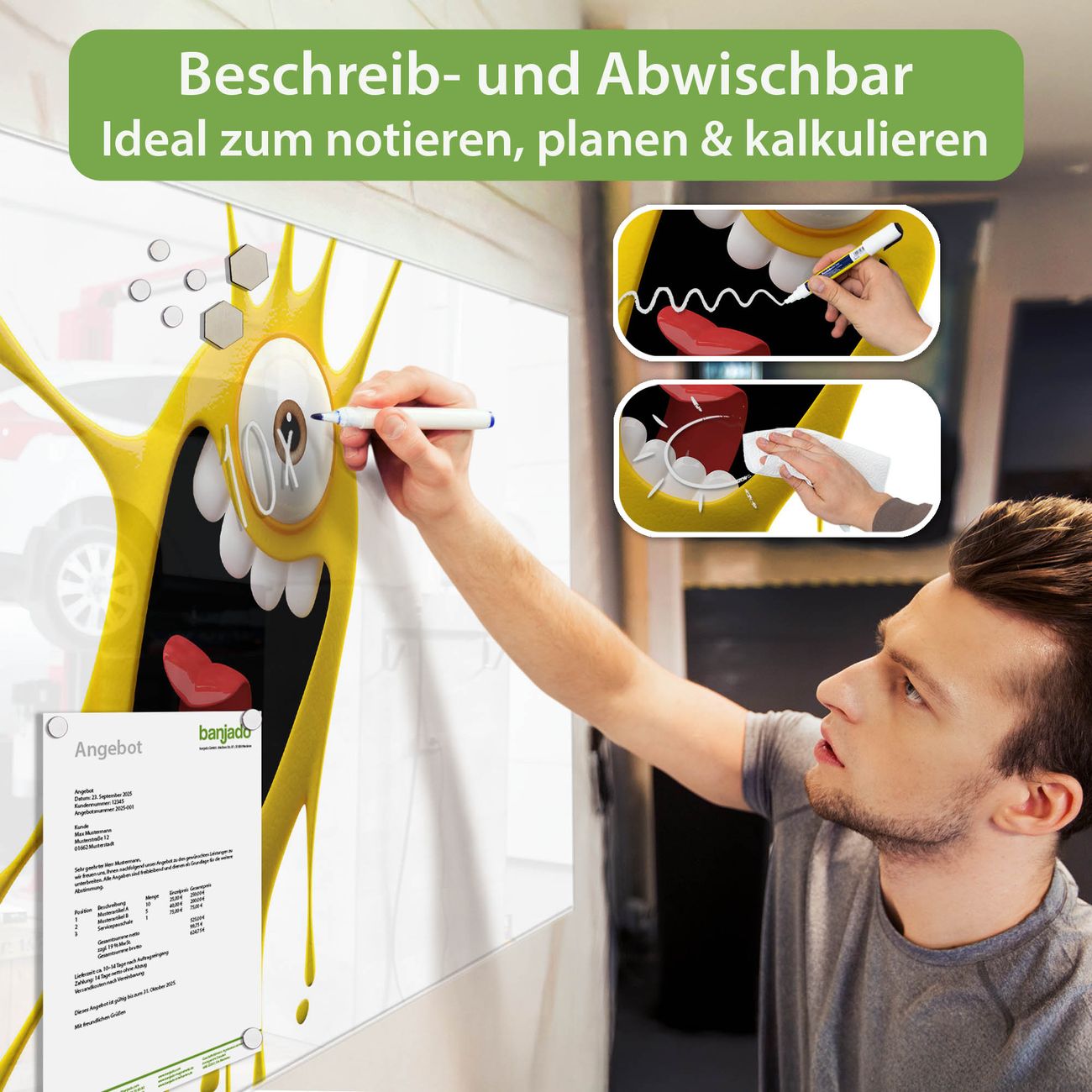 Jede Glas Magnettafel wird in unserer Werkstatt von Hand gefertigt und sorgfältig geprüft. So erhalten Sie ein echtes Qualitätsprodukt, das Funktion und Ästhetik perfekt vereint.?? Warum banjado?