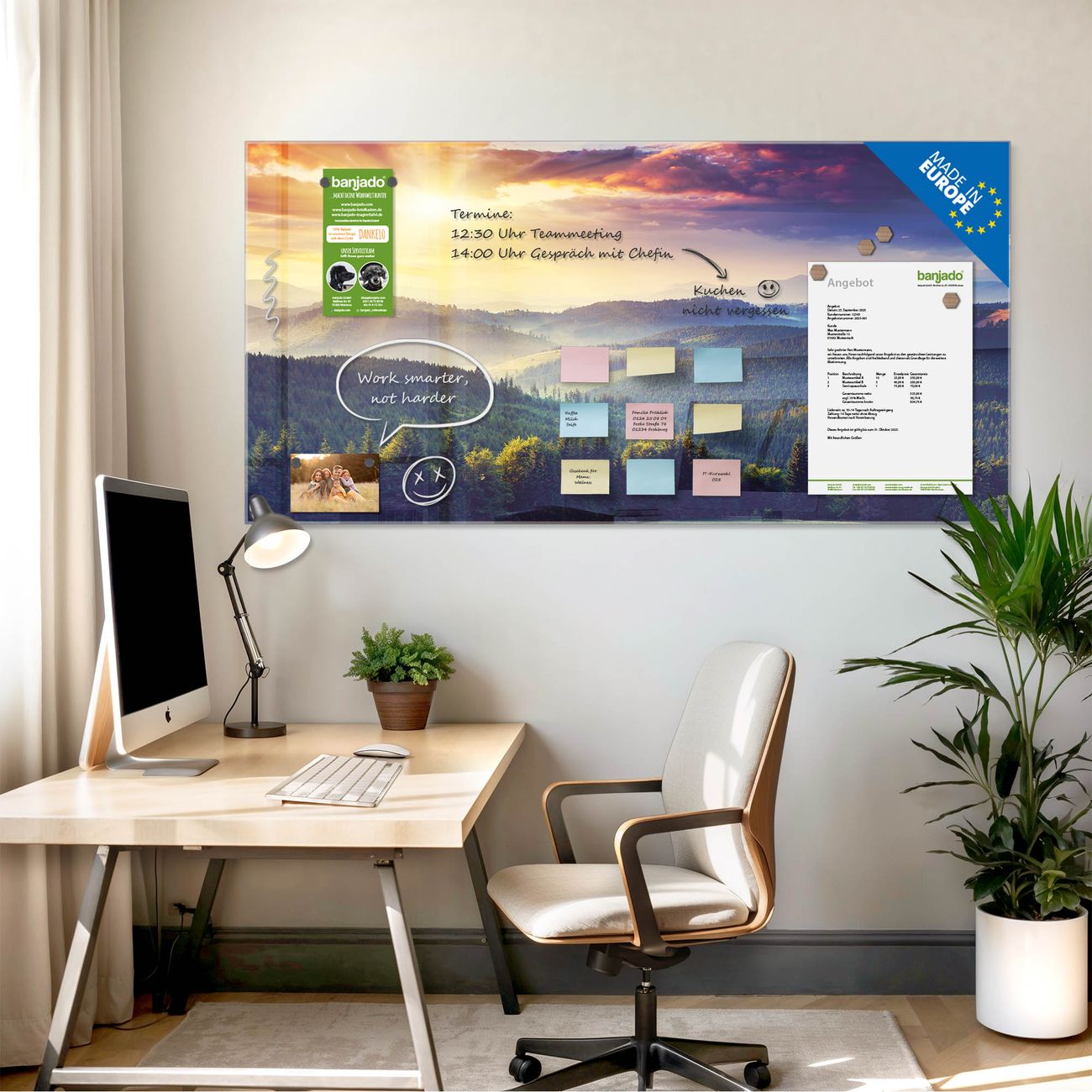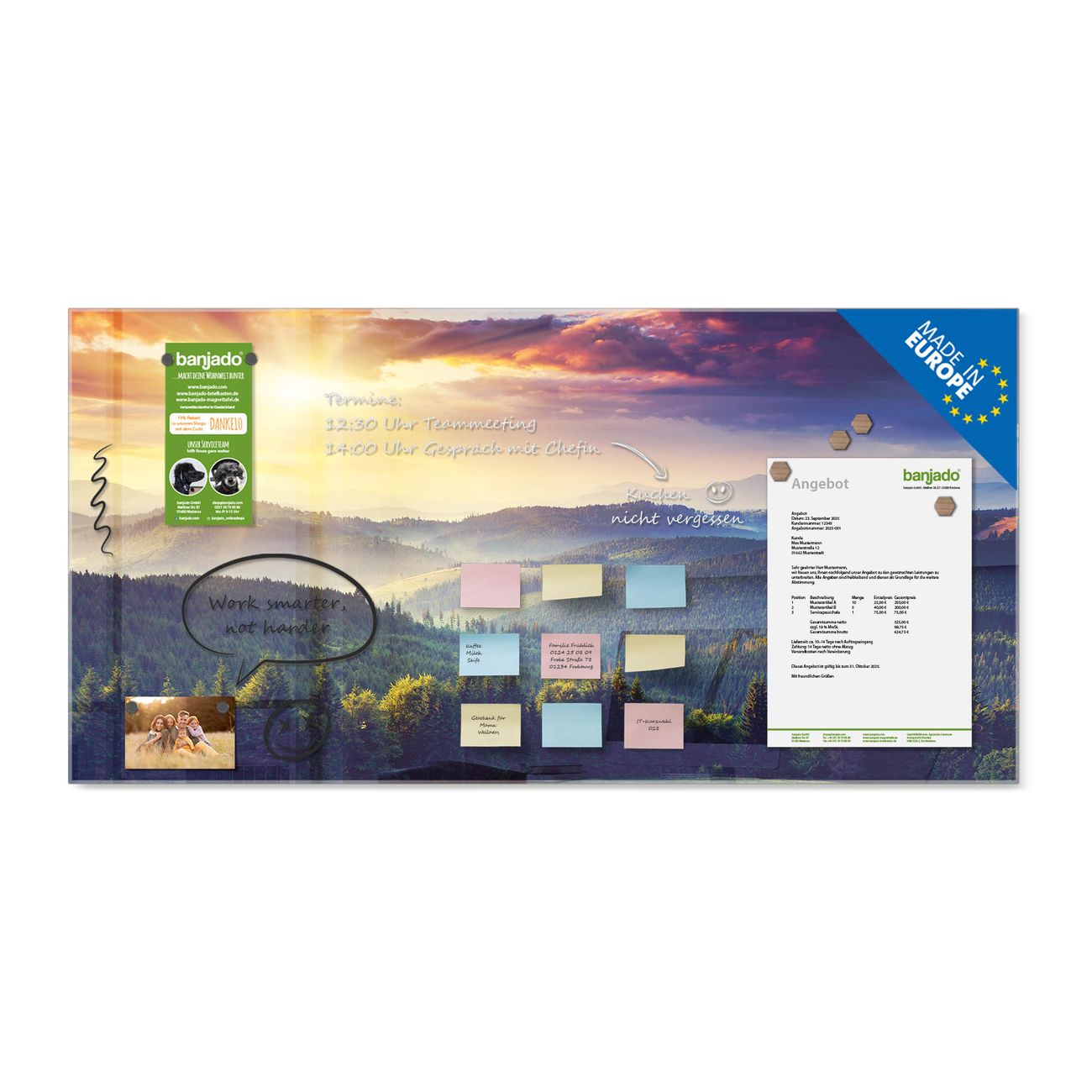 Die banjado Glas Magnettafel mit dem Motiv Motiv Karpaten Sonnenuntergang verbindet Funktionalität mit Stil. Sie ersetzt das Zettelchaos durch klare Strukturen und bringt dabei eine warme, natürliche Atmosphäre in Ihr Zuhause. Ob im Büro, in der Küche oder im Eingangsbereich - dieses Design-Board zieht Blicke an und sorgt für Ordnung mit Charakter.