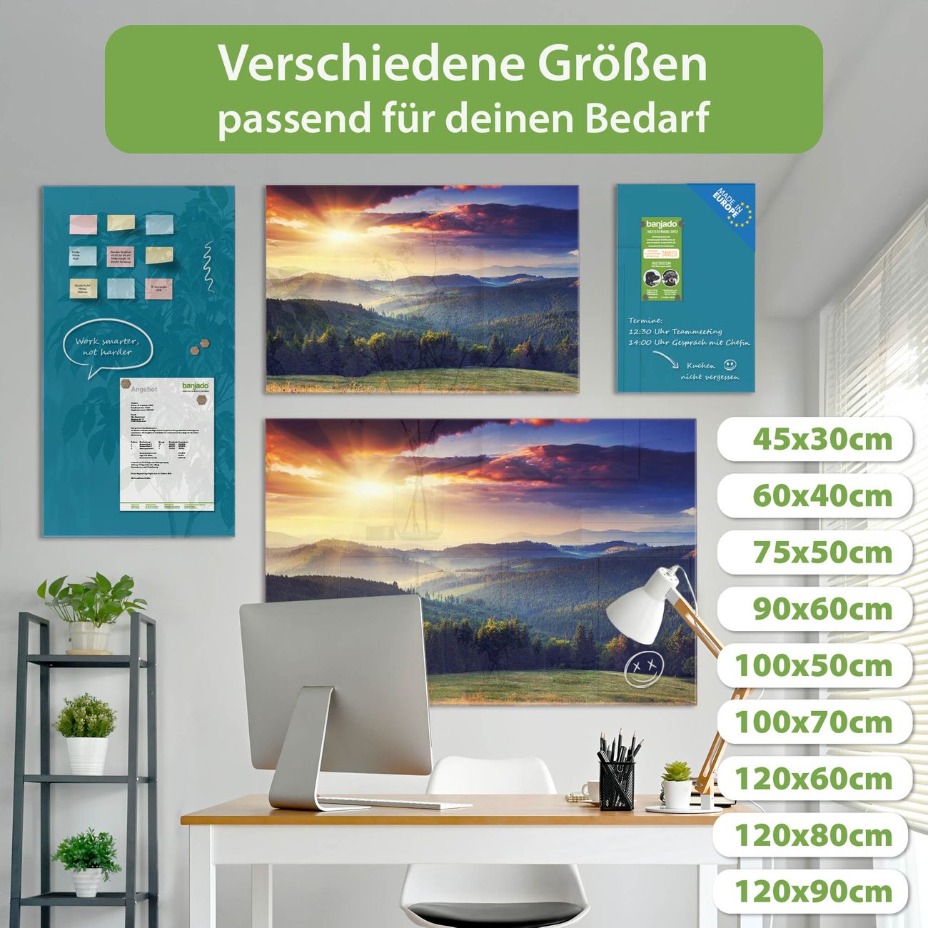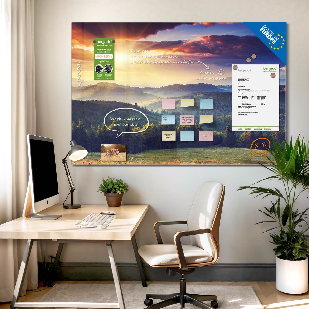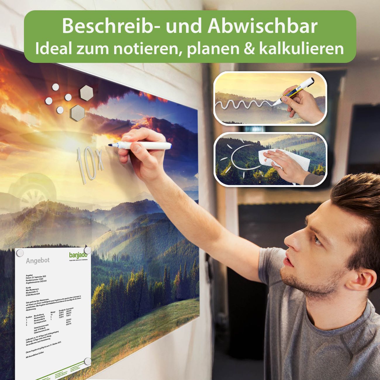 Jede Glas Magnettafel wird in unserer Werkstatt von Hand gefertigt und sorgfältig geprüft. So erhalten Sie ein echtes Qualitätsprodukt, das Funktion und Ästhetik perfekt vereint.?? Warum banjado?