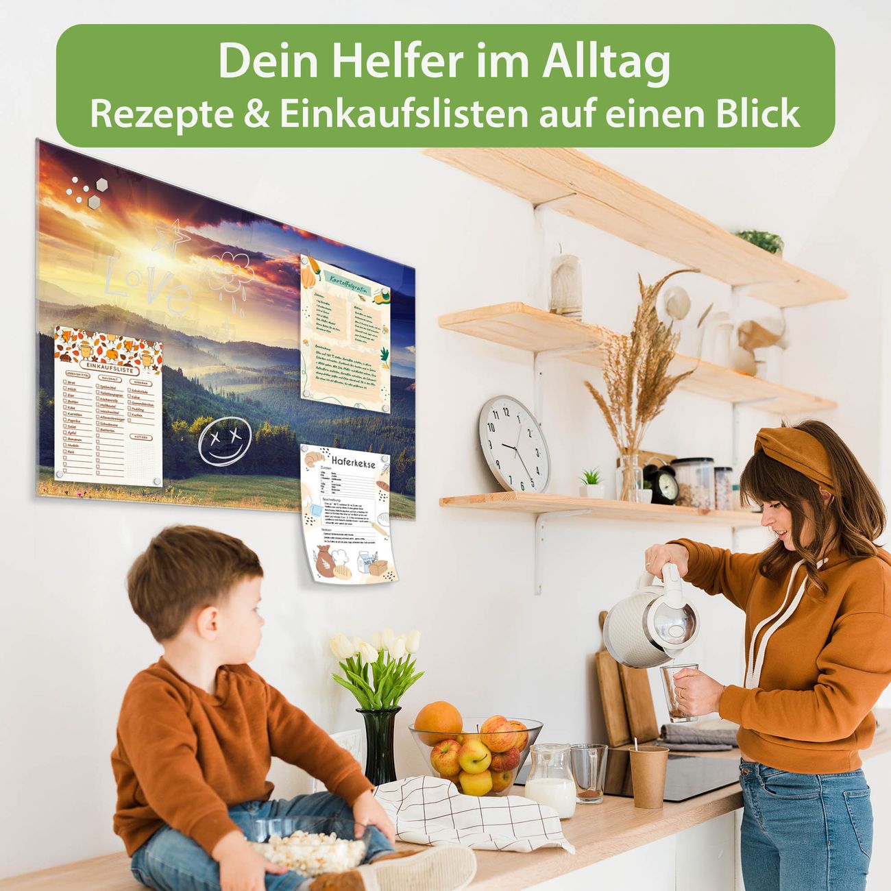 Auf der glatten Glasoberfläche lassen sich Termine, Rezepte oder Notizen ganz einfach mit Kreidestiften festhalten und rückstandslos entfernen. Starke Neodym-Magnete halten Ihre wichtigsten Erinnerungen sicher an Ort und Stelle. So entsteht Ihre ganz persönliche Ideenwand - jeden Tag neu.