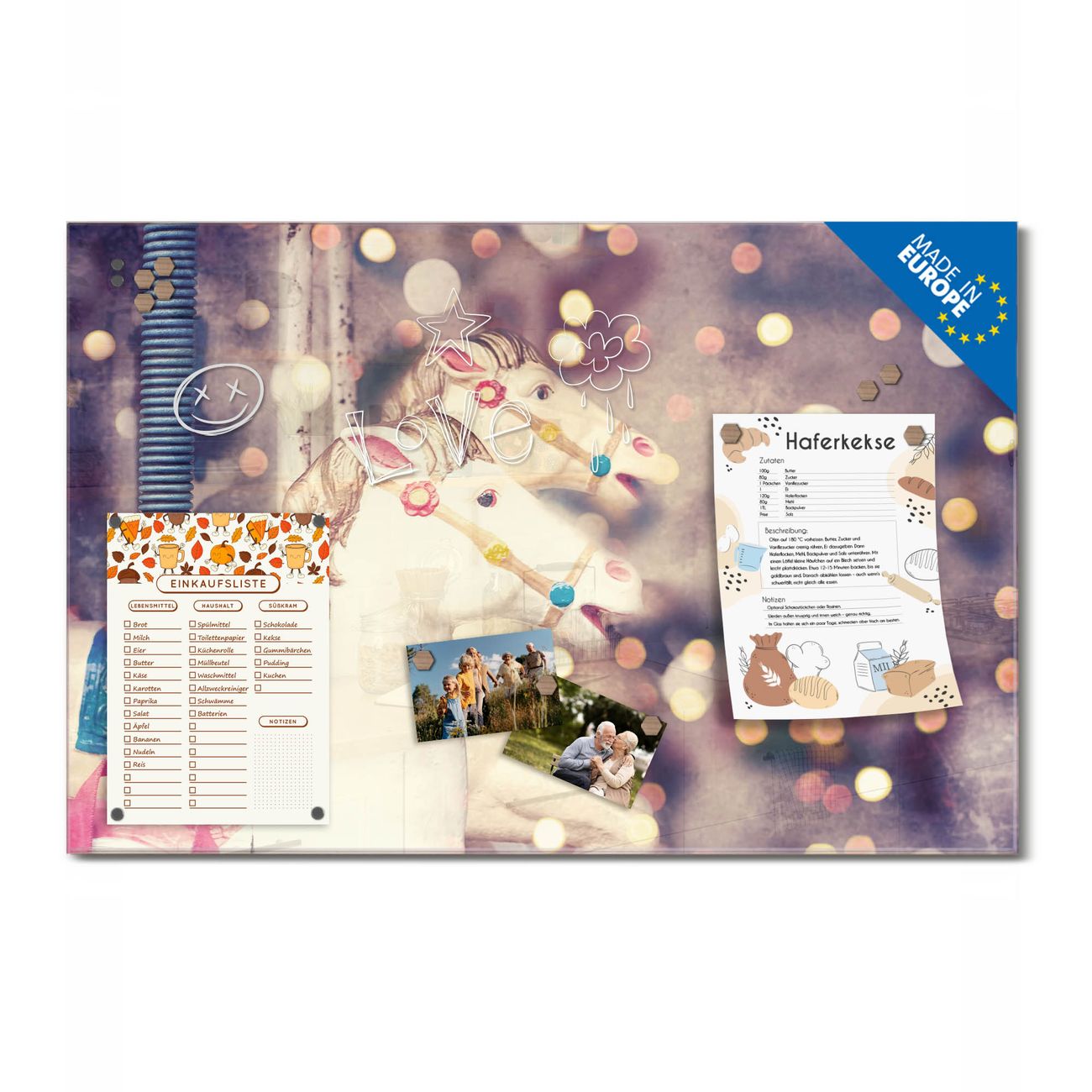 Ein Stück Design, das Ihren Alltag organisiert. Schreiben, heften, inspirieren - alles an einem Ort. Qualität, die man spürt. Montage leicht gemacht. Handwerk mit Herz - veredelt in Sachsen. Einzigartiges Design mit Motiv Motiv Kinderkarussell Beschreibbare Glasoberfläche, leicht zu reinigen Starke Magnetkraft durch Stahlrückwand Inklusive 4 Neodym-Magneten Flexible Montageoptionen Handveredelt in Sachsen - Qualität, die bleibt