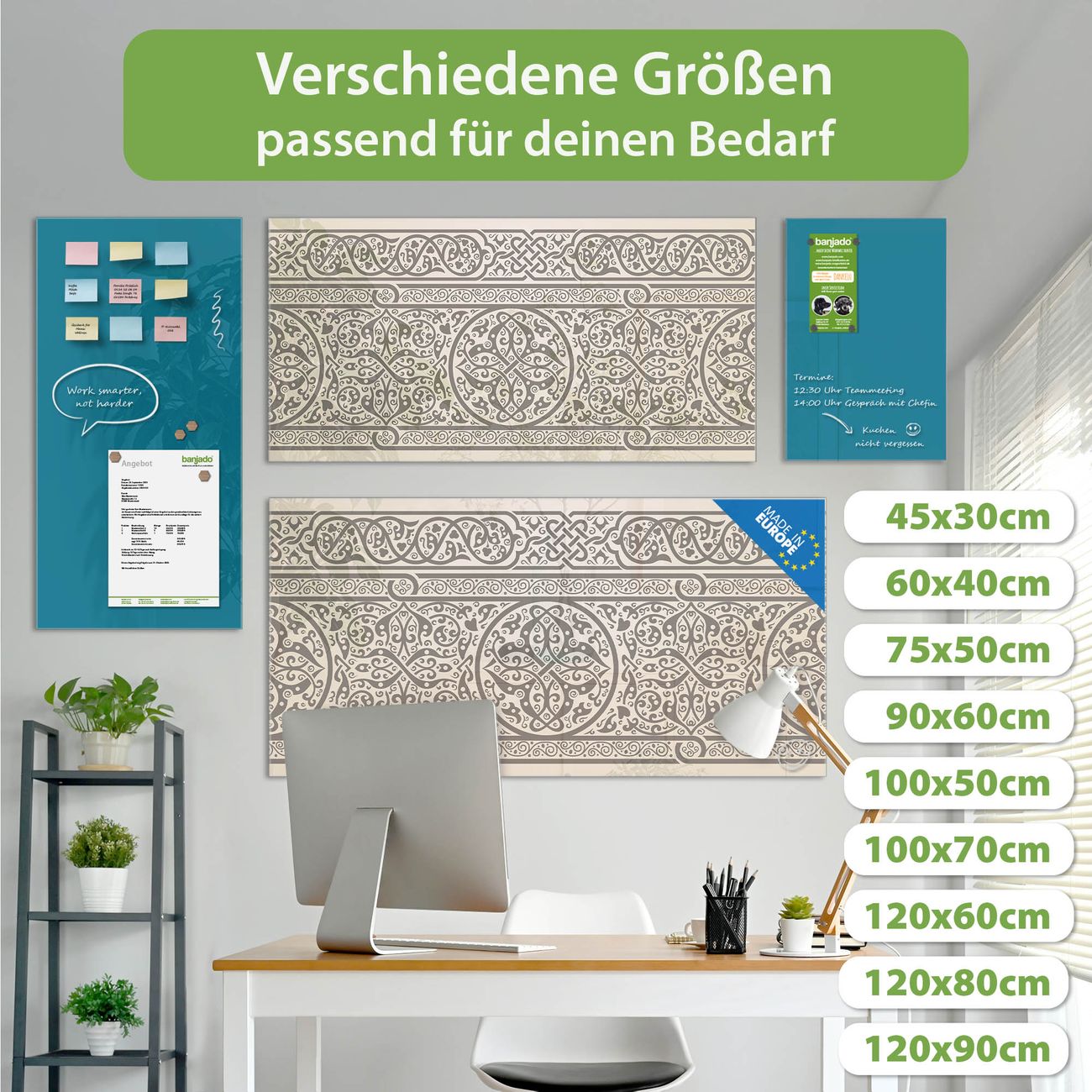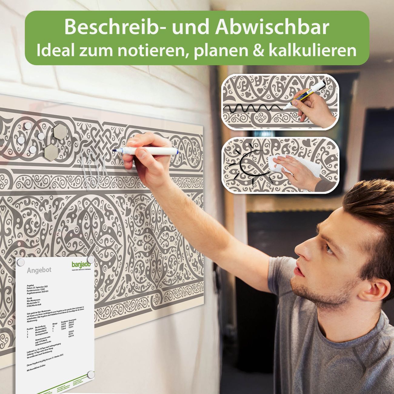 Jede Glas Magnettafel wird in unserer Werkstatt von Hand gefertigt und sorgfältig geprüft. So erhalten Sie ein echtes Qualitätsprodukt, das Funktion und Ästhetik perfekt vereint.?? Warum banjado?