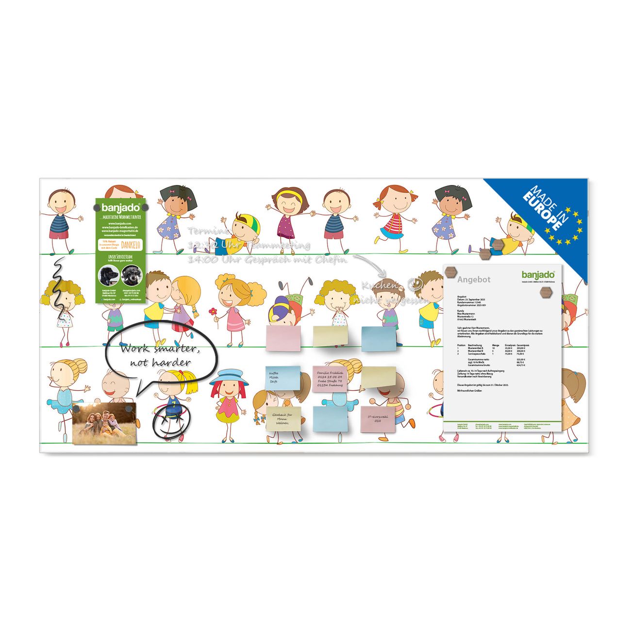 Ein Stück Design, das Ihren Alltag organisiert. Schreiben, heften, inspirieren - alles an einem Ort. Qualität, die man spürt. Montage leicht gemacht. Handwerk mit Herz - veredelt in Sachsen. Einzigartiges Design mit Motiv Motiv Kinder Beschreibbare Glasoberfläche, leicht zu reinigen Starke Magnetkraft durch Stahlrückwand Inklusive 4 Neodym-Magneten Flexible Montageoptionen Handveredelt in Sachsen - Qualität, die bleibt
