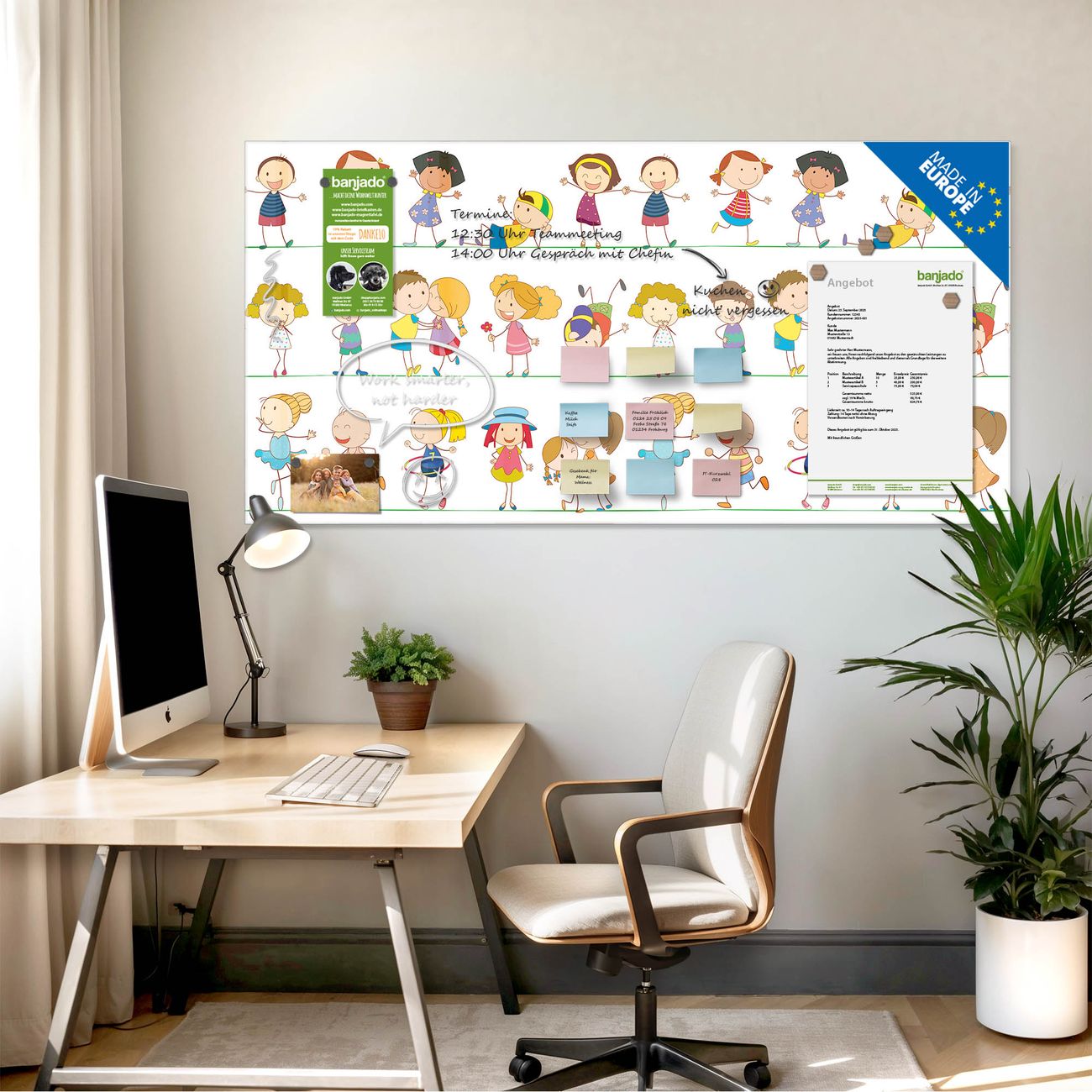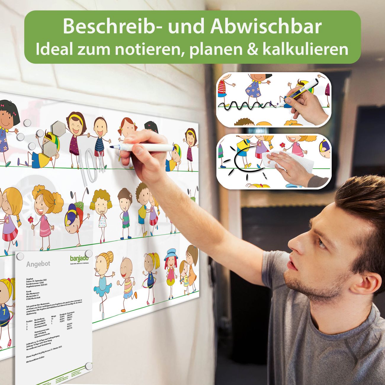 Jede Glas Magnettafel wird in unserer Werkstatt von Hand gefertigt und sorgfältig geprüft. So erhalten Sie ein echtes Qualitätsprodukt, das Funktion und Ästhetik perfekt vereint.?? Warum banjado?