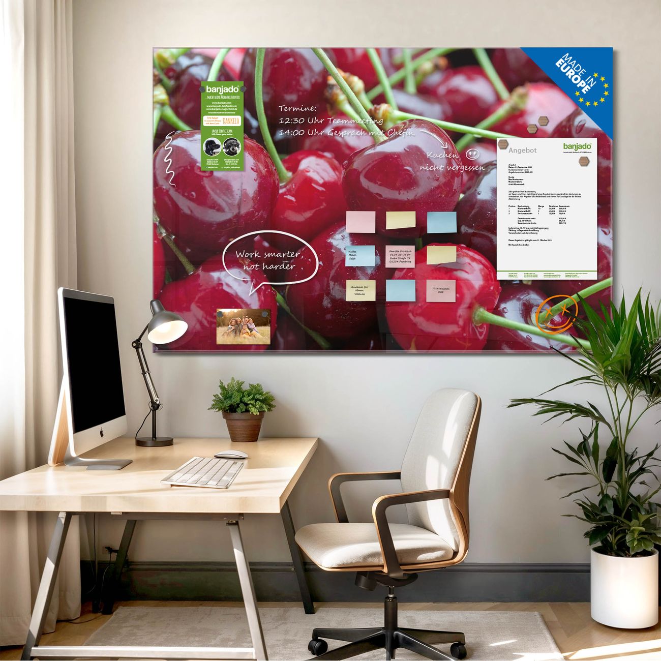 Jede Glas Magnettafel wird in unserer Werkstatt von Hand gefertigt und sorgfältig geprüft. So erhalten Sie ein echtes Qualitätsprodukt, das Funktion und Ästhetik perfekt vereint.?? Warum banjado?
