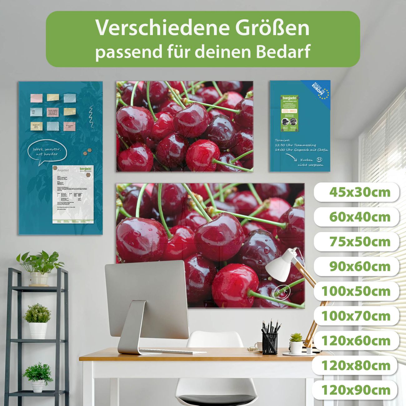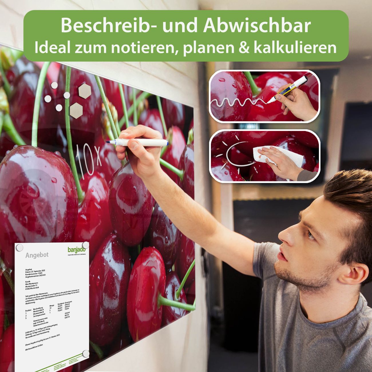 Ein Stück Design, das Ihren Alltag organisiert. Schreiben, heften, inspirieren - alles an einem Ort. Qualität, die man spürt. Montage leicht gemacht. Handwerk mit Herz - veredelt in Sachsen. Einzigartiges Design mit Motiv Motiv Kirschen Beschreibbare Glasoberfläche, leicht zu reinigen Starke Magnetkraft durch Stahlrückwand Inklusive 4 Neodym-Magneten Flexible Montageoptionen Handveredelt in Sachsen - Qualität, die bleibt