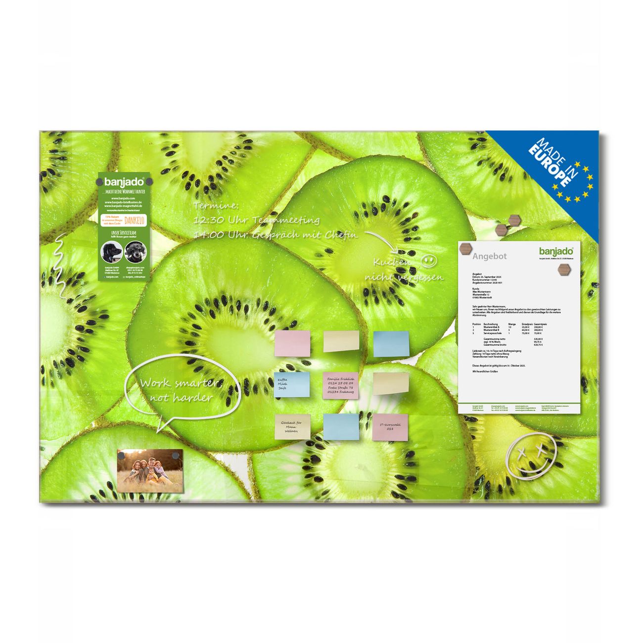 Jede Glas Magnettafel wird in unserer Werkstatt von Hand gefertigt und sorgfältig geprüft. So erhalten Sie ein echtes Qualitätsprodukt, das Funktion und Ästhetik perfekt vereint.?? Warum banjado?