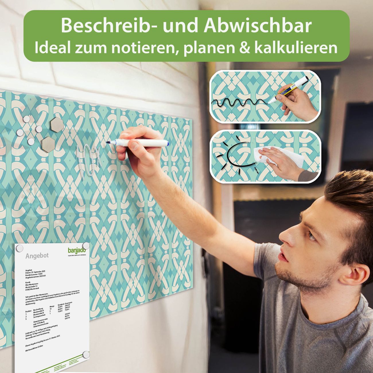 Jede Glas Magnettafel wird in unserer Werkstatt von Hand gefertigt und sorgfältig geprüft. So erhalten Sie ein echtes Qualitätsprodukt, das Funktion und Ästhetik perfekt vereint.?? Warum banjado?