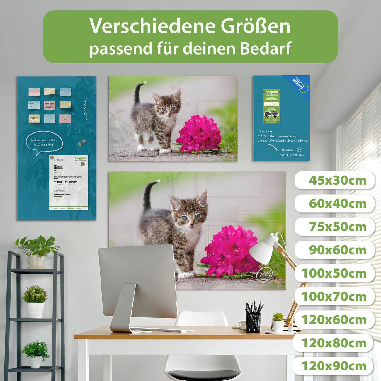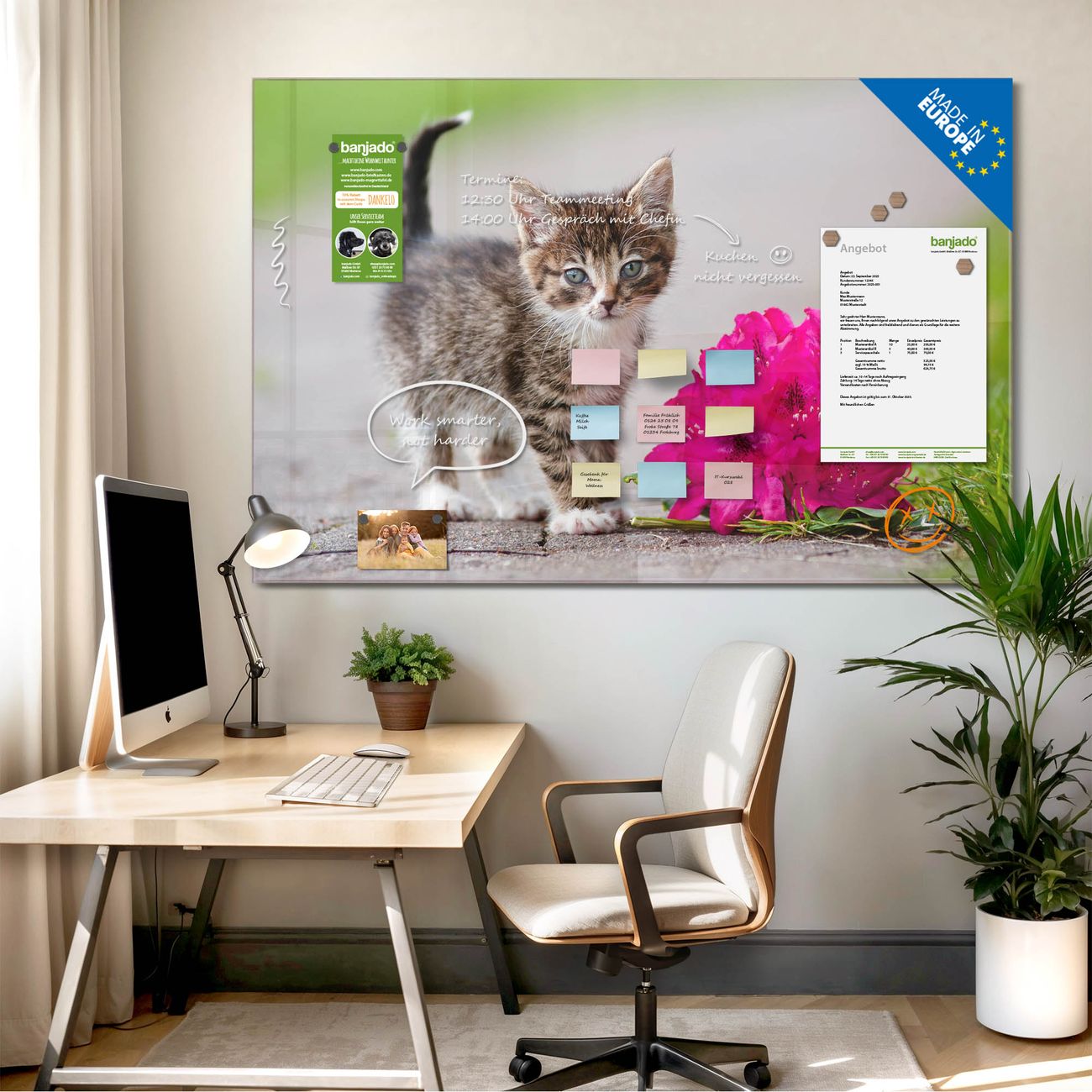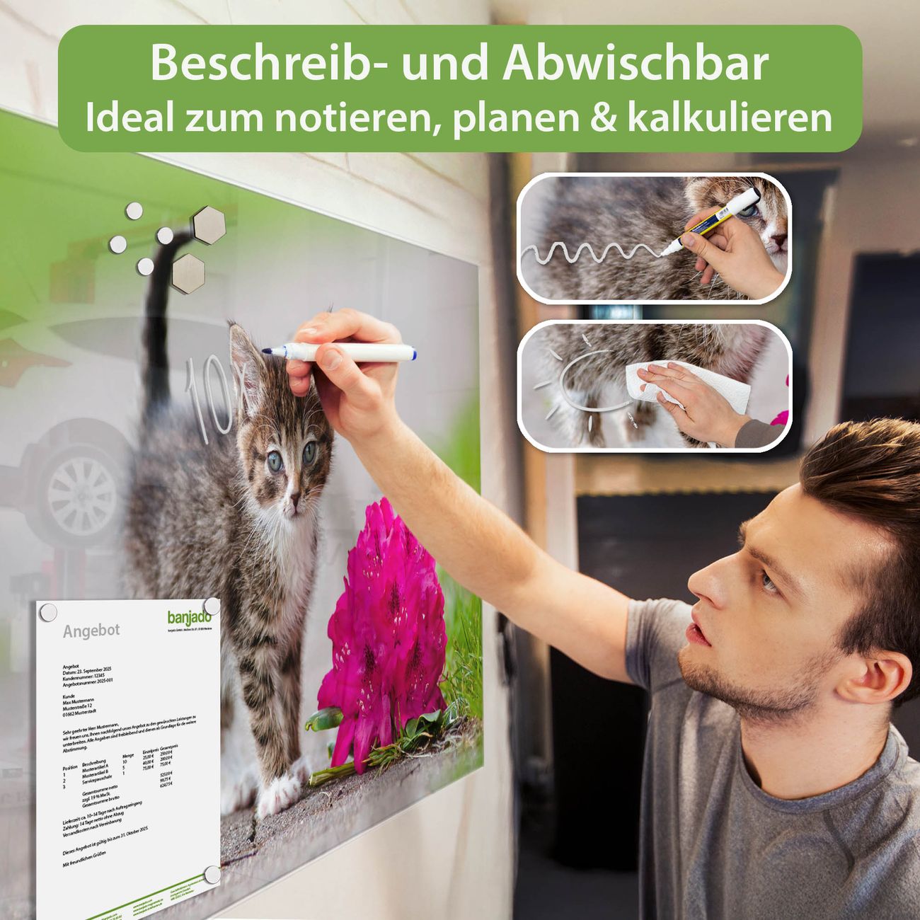 Jede Glas Magnettafel wird in unserer Werkstatt von Hand gefertigt und sorgfältig geprüft. So erhalten Sie ein echtes Qualitätsprodukt, das Funktion und Ästhetik perfekt vereint.?? Warum banjado?