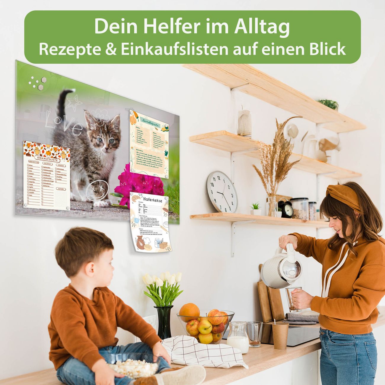 Auf der glatten Glasoberfläche lassen sich Termine, Rezepte oder Notizen ganz einfach mit Kreidestiften festhalten und rückstandslos entfernen. Starke Neodym-Magnete halten Ihre wichtigsten Erinnerungen sicher an Ort und Stelle. So entsteht Ihre ganz persönliche Ideenwand - jeden Tag neu.