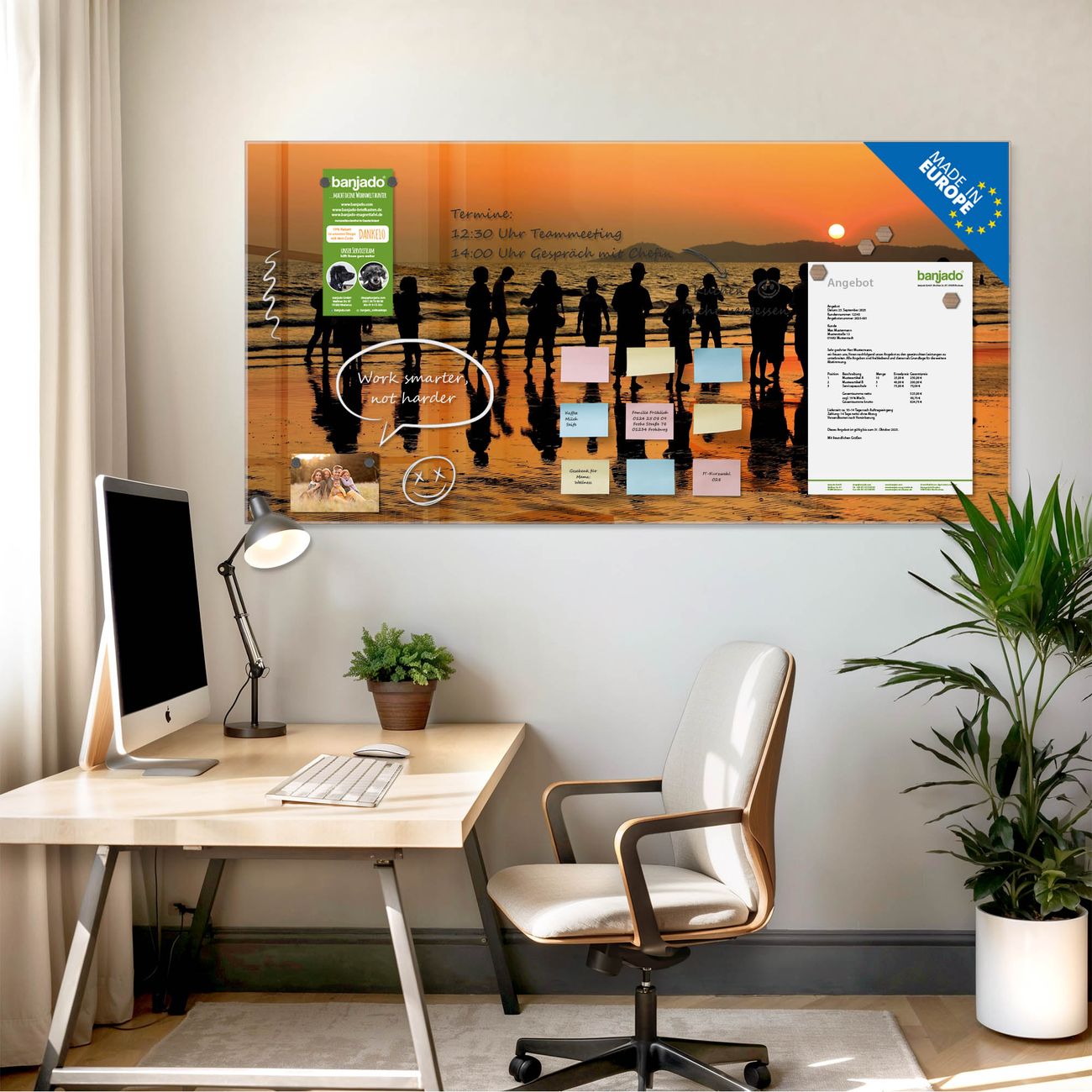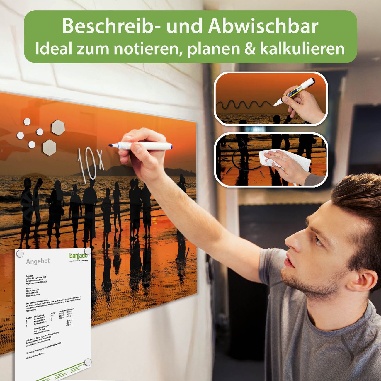 Jede Glas Magnettafel wird in unserer Werkstatt von Hand gefertigt und sorgfältig geprüft. So erhalten Sie ein echtes Qualitätsprodukt, das Funktion und Ästhetik perfekt vereint.?? Warum banjado?