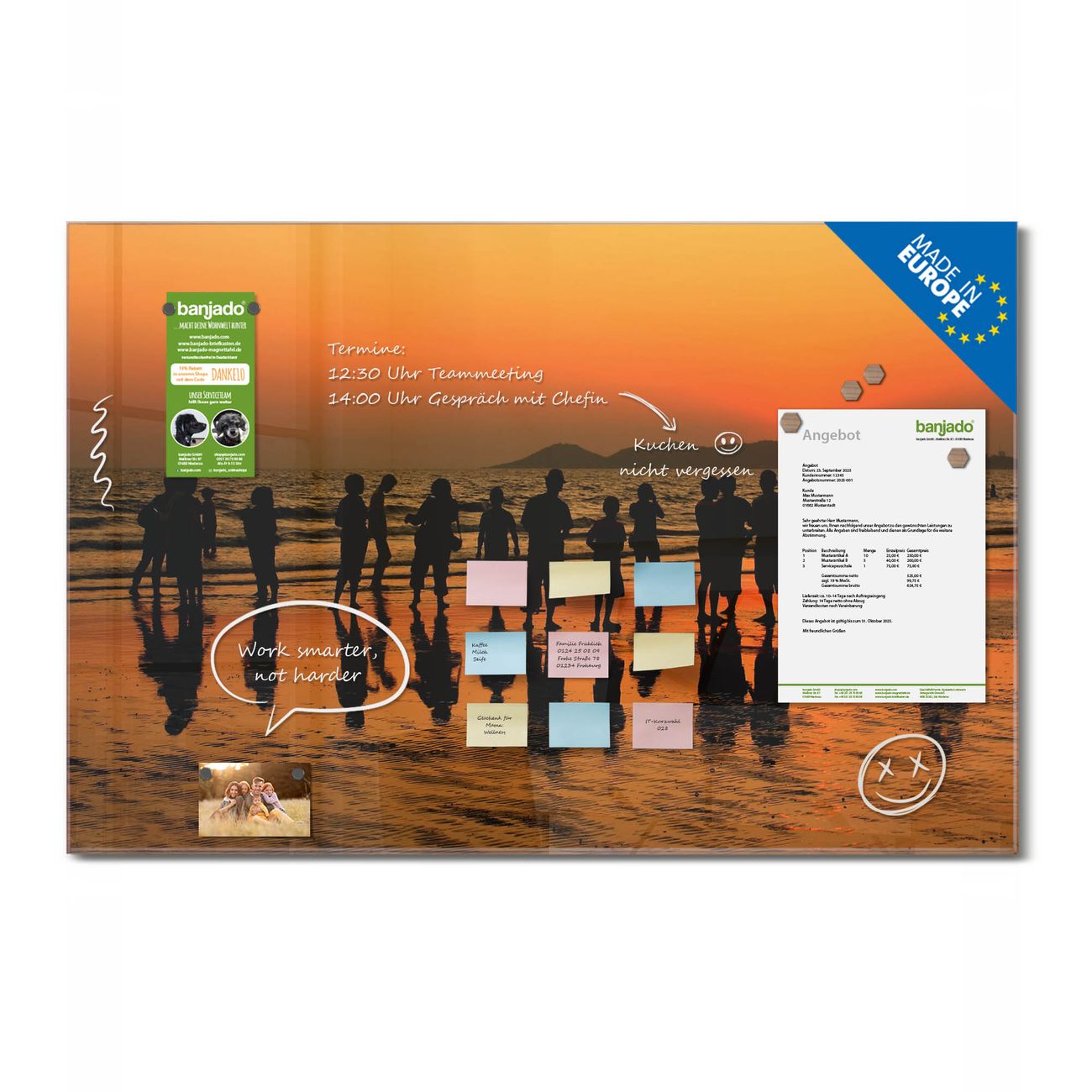 Jede Glas Magnettafel wird in unserer Werkstatt von Hand gefertigt und sorgfältig geprüft. So erhalten Sie ein echtes Qualitätsprodukt, das Funktion und Ästhetik perfekt vereint.?? Warum banjado?