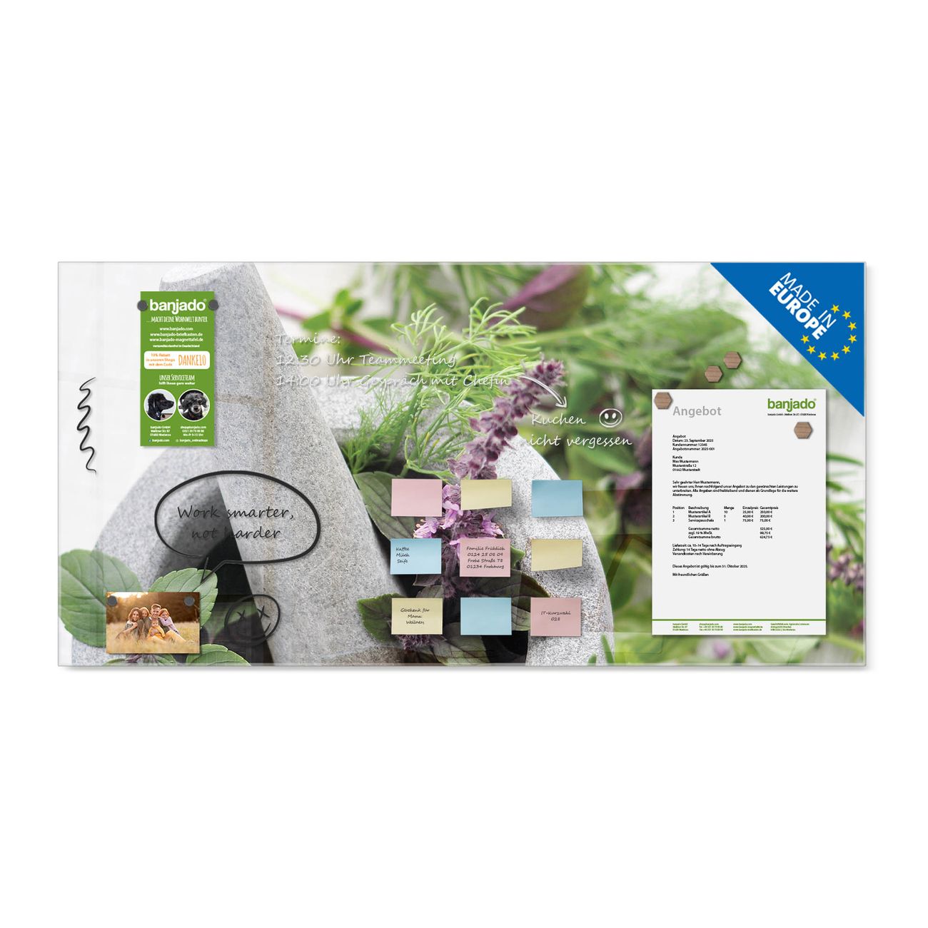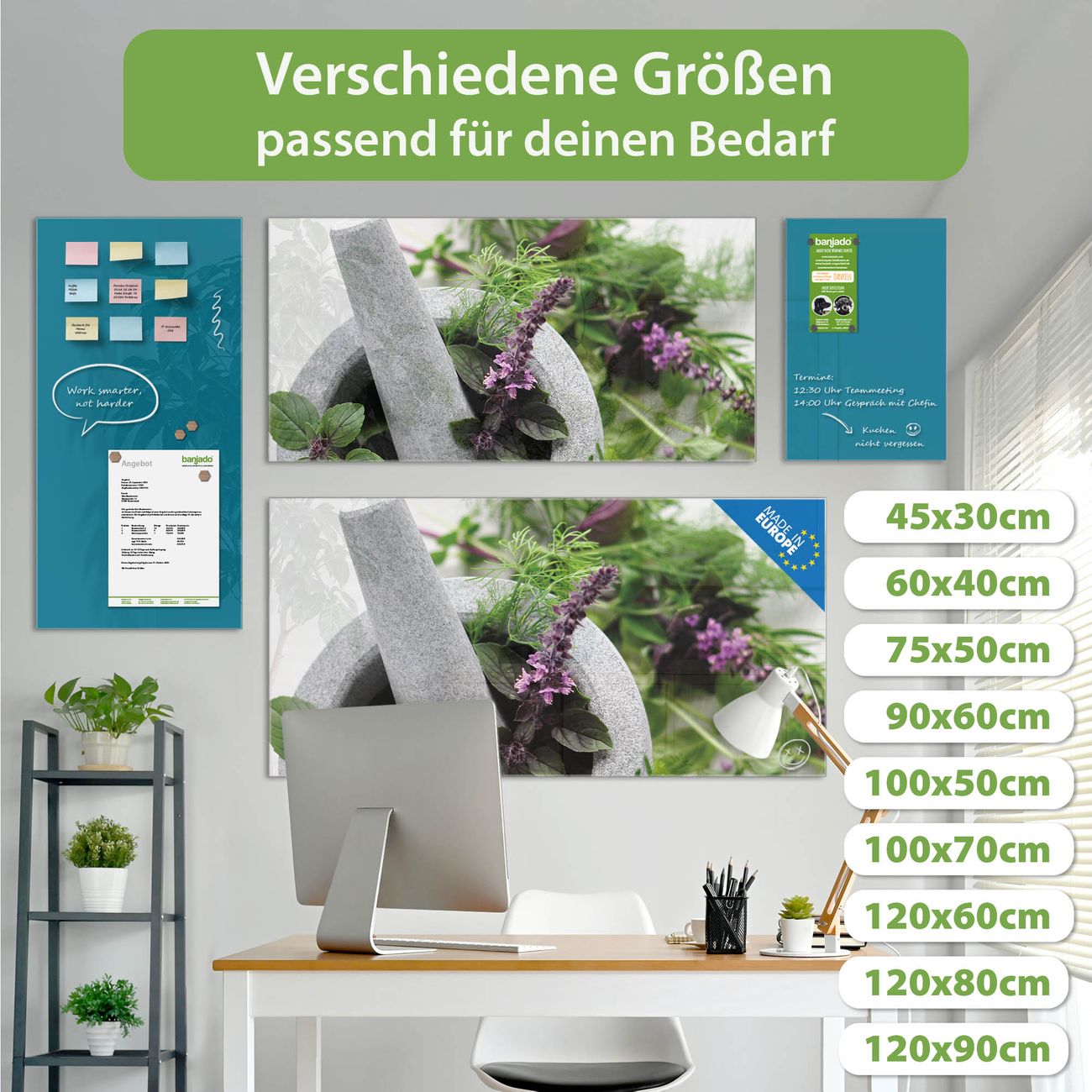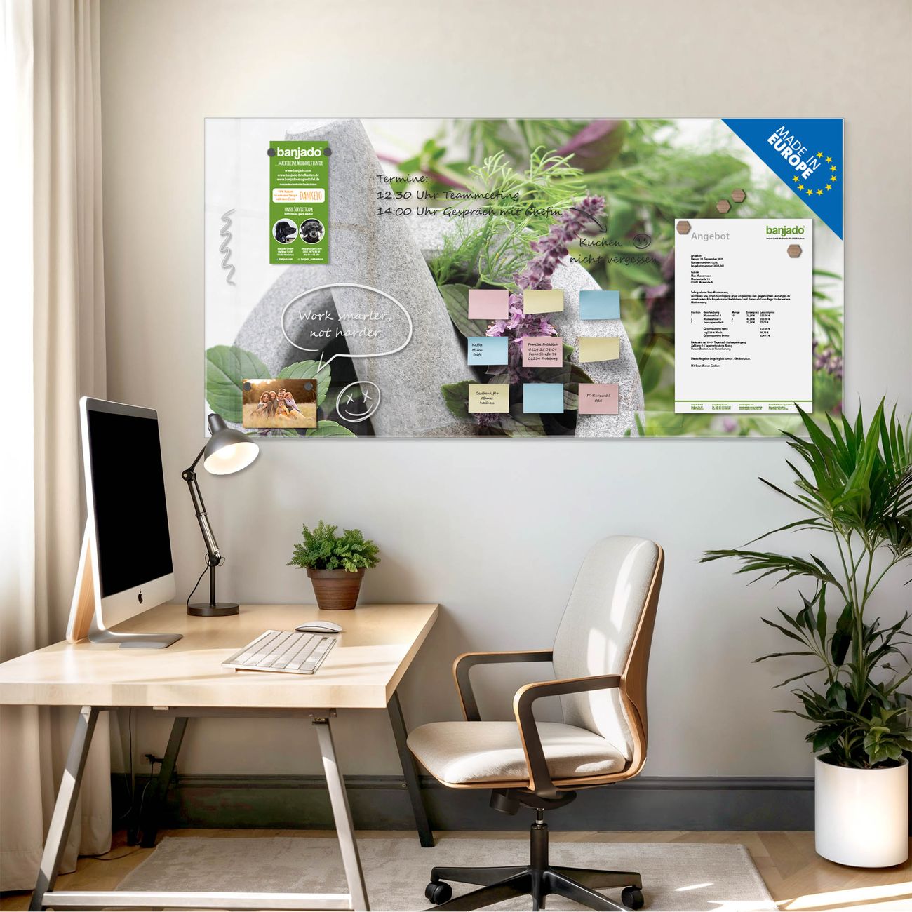 Jede Glas Magnettafel wird in unserer Werkstatt von Hand gefertigt und sorgfältig geprüft. So erhalten Sie ein echtes Qualitätsprodukt, das Funktion und Ästhetik perfekt vereint.?? Warum banjado?
