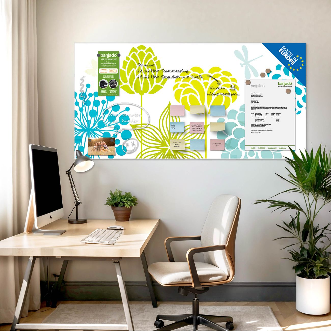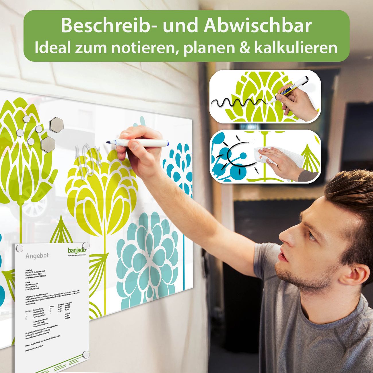 Jede Glas Magnettafel wird in unserer Werkstatt von Hand gefertigt und sorgfältig geprüft. So erhalten Sie ein echtes Qualitätsprodukt, das Funktion und Ästhetik perfekt vereint.?? Warum banjado?