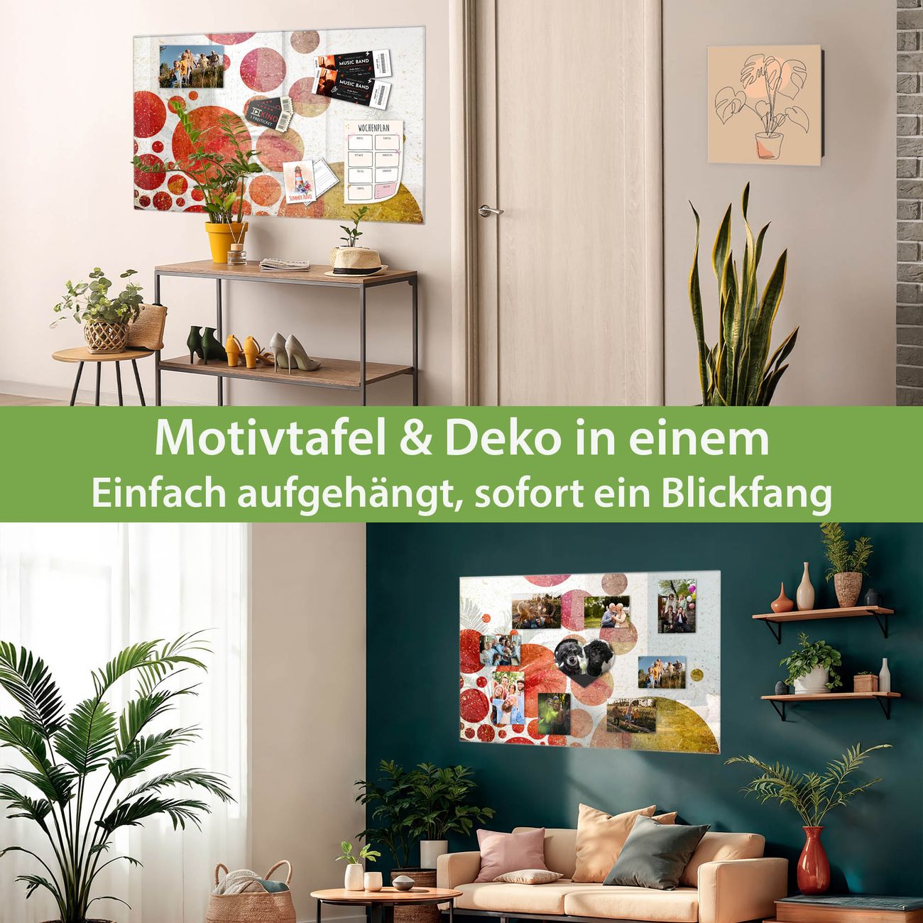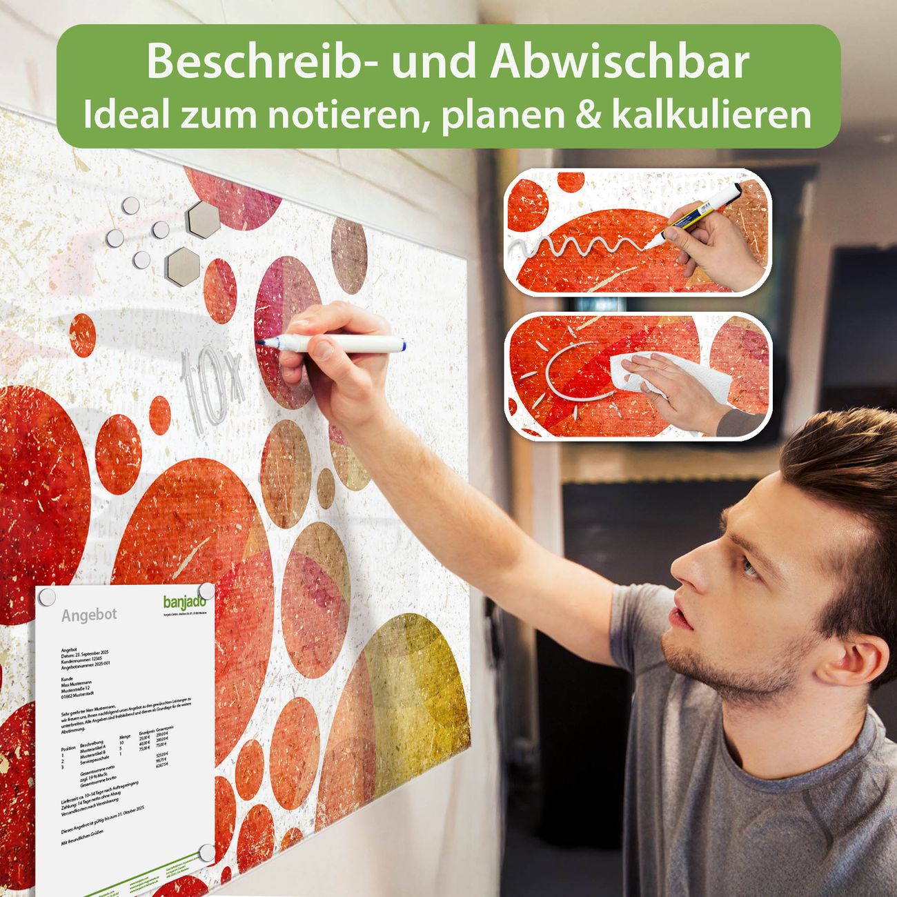 Die banjado Glas Magnettafel mit dem Motiv Motiv Kreise verbindet Funktionalität mit Stil. Sie ersetzt das Zettelchaos durch klare Strukturen und bringt dabei eine warme, natürliche Atmosphäre in Ihr Zuhause. Ob im Büro, in der Küche oder im Eingangsbereich - dieses Design-Board zieht Blicke an und sorgt für Ordnung mit Charakter.