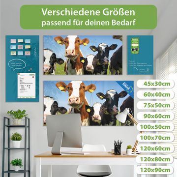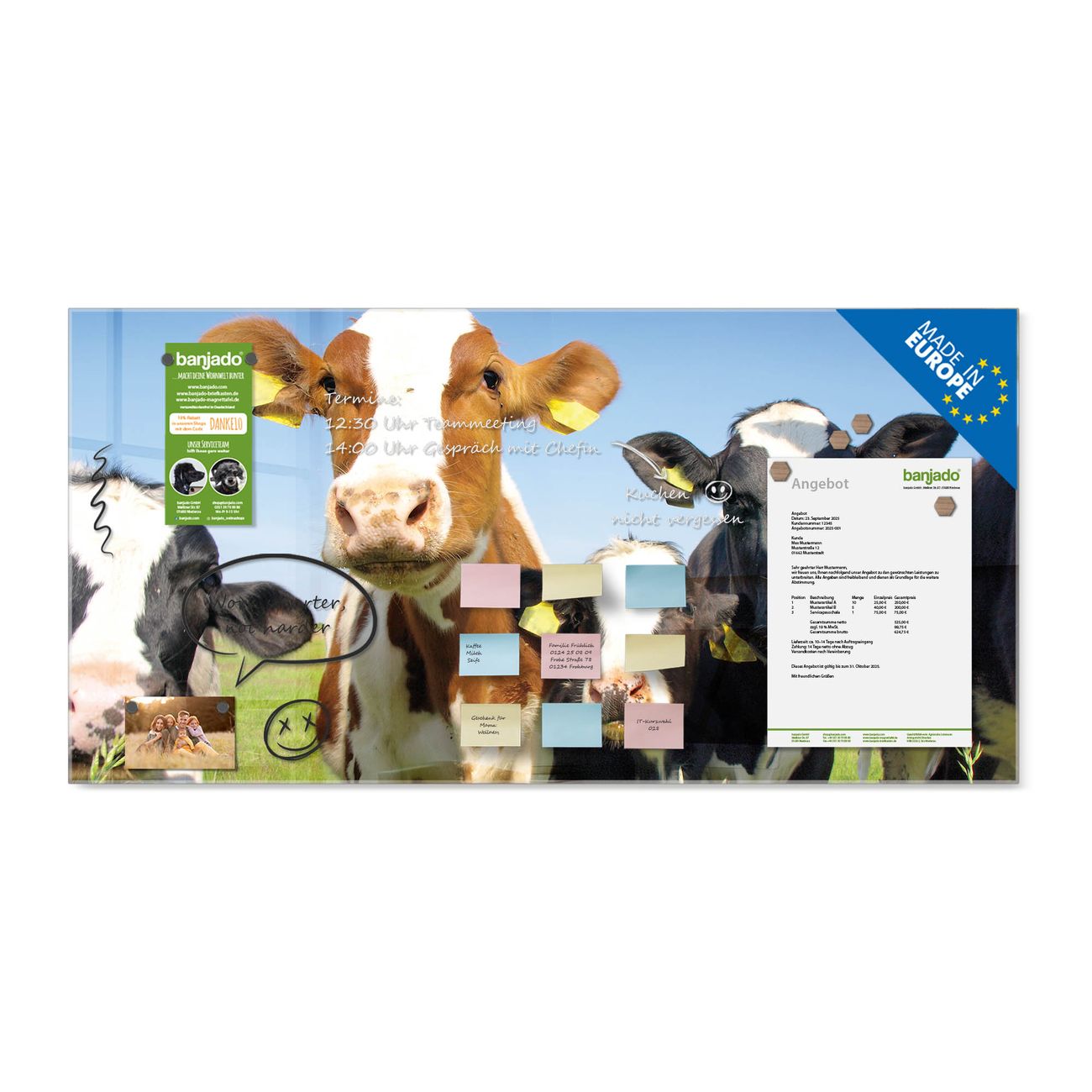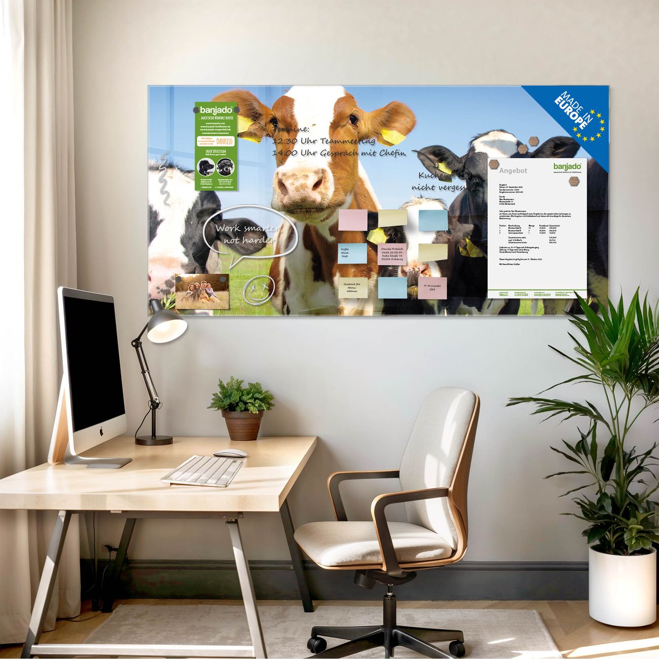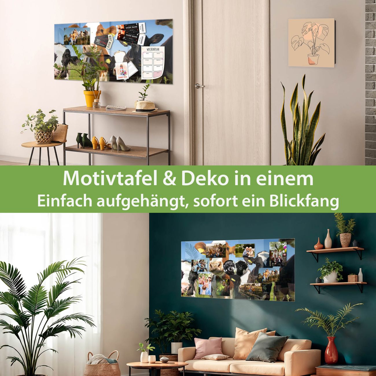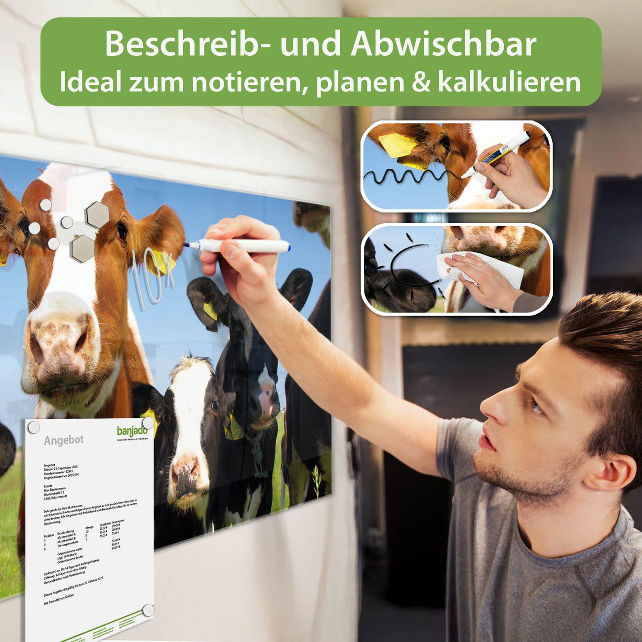 Die banjado Glas Magnettafel mit dem Motiv Motiv Kühe verbindet Funktionalität mit Stil. Sie ersetzt das Zettelchaos durch klare Strukturen und bringt dabei eine warme, natürliche Atmosphäre in Ihr Zuhause. Ob im Büro, in der Küche oder im Eingangsbereich - dieses Design-Board zieht Blicke an und sorgt für Ordnung mit Charakter.