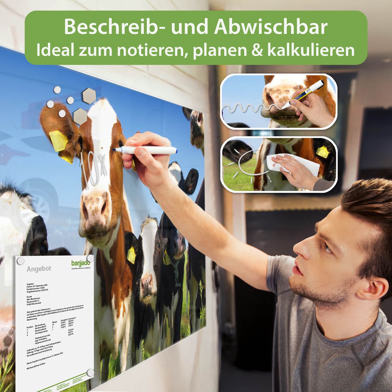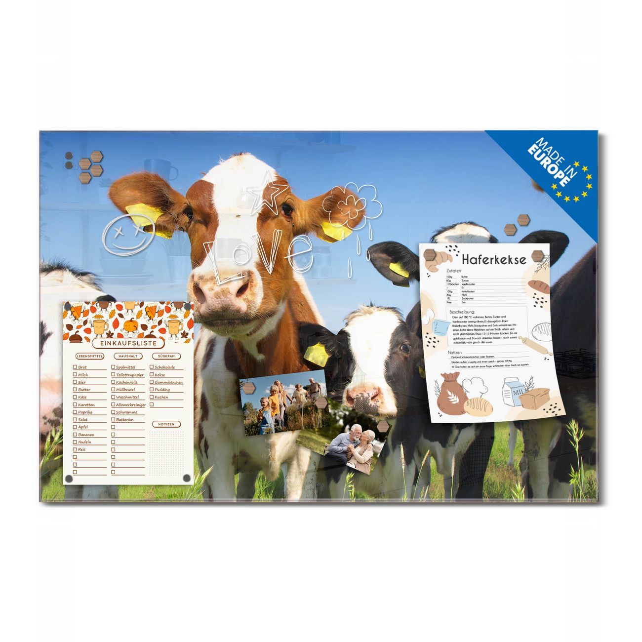 Ein Stück Design, das Ihren Alltag organisiert. Schreiben, heften, inspirieren - alles an einem Ort. Qualität, die man spürt. Montage leicht gemacht. Handwerk mit Herz - veredelt in Sachsen. Einzigartiges Design mit Motiv Motiv Kühe Beschreibbare Glasoberfläche, leicht zu reinigen Starke Magnetkraft durch Stahlrückwand Inklusive 4 Neodym-Magneten Flexible Montageoptionen Handveredelt in Sachsen - Qualität, die bleibt