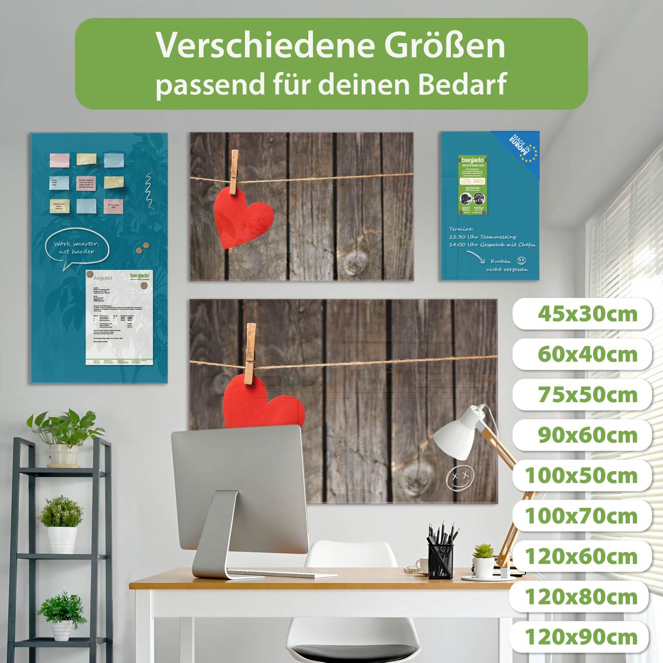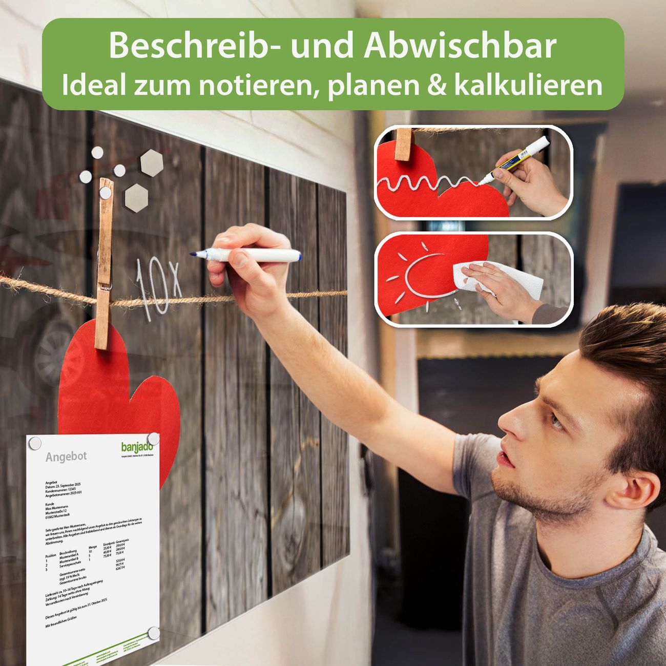 Jede Glas Magnettafel wird in unserer Werkstatt von Hand gefertigt und sorgfältig geprüft. So erhalten Sie ein echtes Qualitätsprodukt, das Funktion und Ästhetik perfekt vereint.?? Warum banjado?