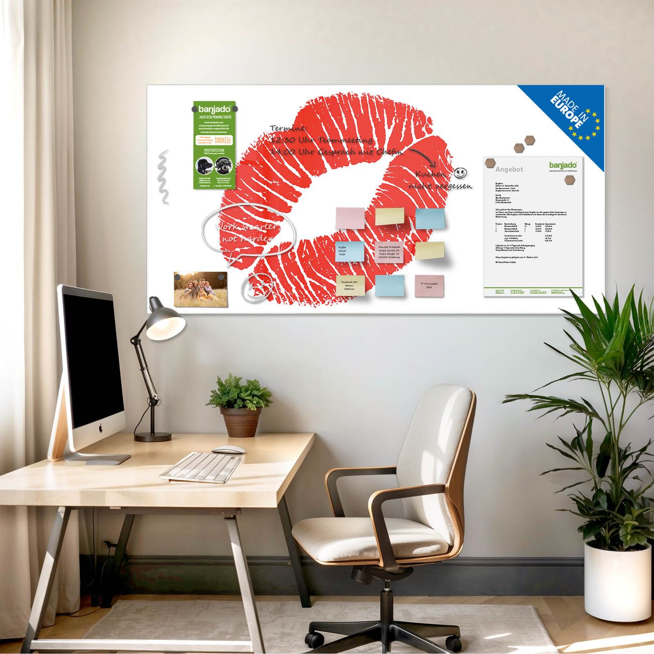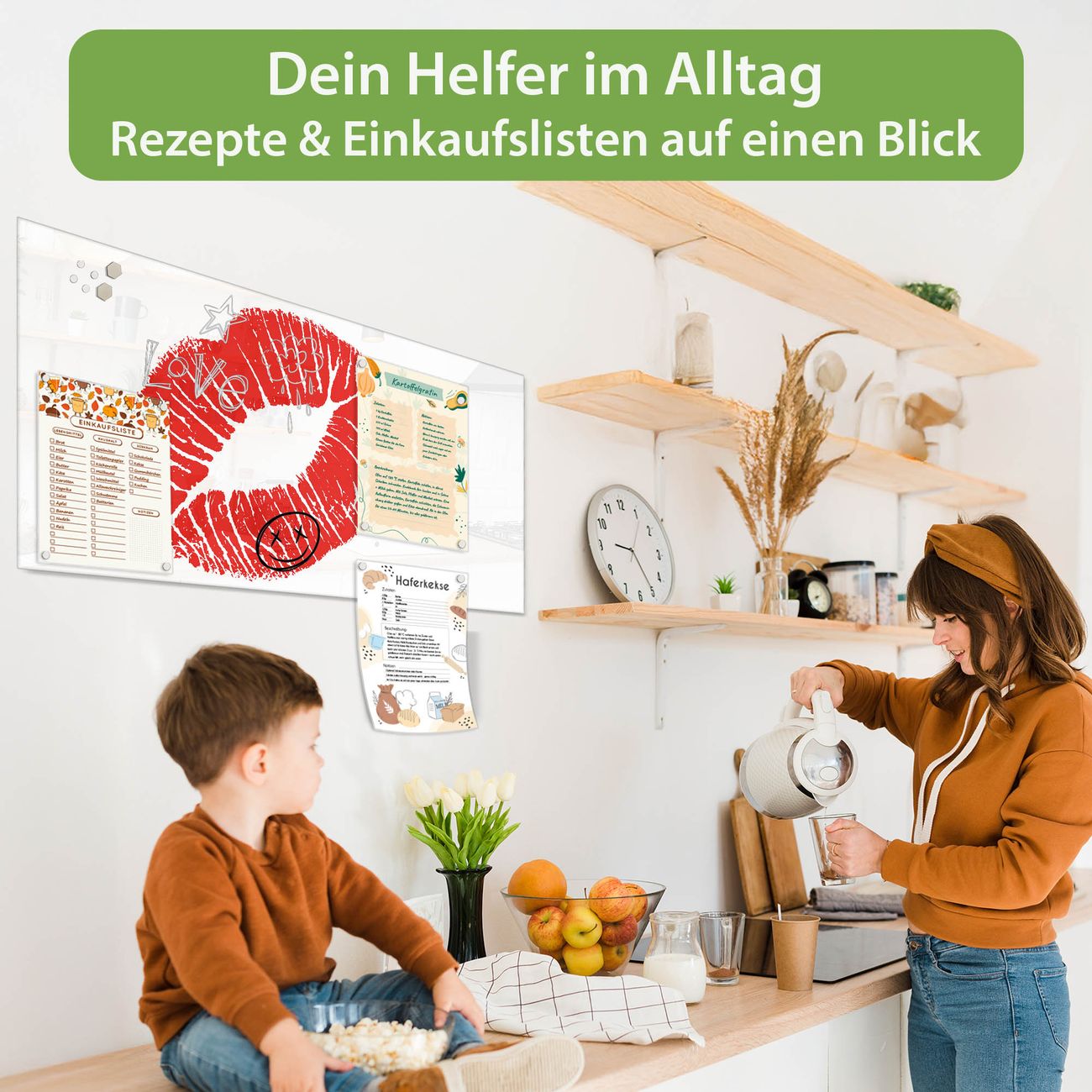 Ein Stück Design, das Ihren Alltag organisiert. Schreiben, heften, inspirieren - alles an einem Ort. Qualität, die man spürt. Montage leicht gemacht. Handwerk mit Herz - veredelt in Sachsen. Einzigartiges Design mit Motiv Motiv Kussmund Beschreibbare Glasoberfläche, leicht zu reinigen Starke Magnetkraft durch Stahlrückwand Inklusive 4 Neodym-Magneten Flexible Montageoptionen Handveredelt in Sachsen - Qualität, die bleibt