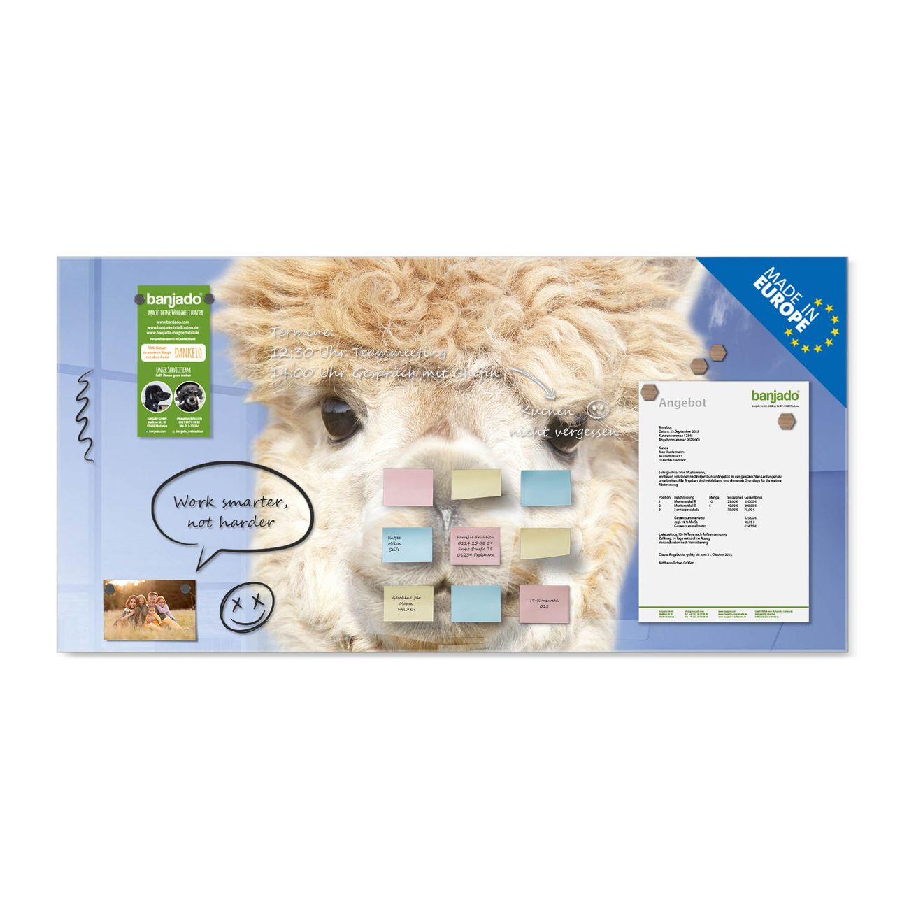 Ein Stück Design, das Ihren Alltag organisiert. Schreiben, heften, inspirieren - alles an einem Ort. Qualität, die man spürt. Montage leicht gemacht. Handwerk mit Herz - veredelt in Sachsen. Einzigartiges Design mit Motiv Motiv Lama Beschreibbare Glasoberfläche, leicht zu reinigen Starke Magnetkraft durch Stahlrückwand Inklusive 4 Neodym-Magneten Flexible Montageoptionen Handveredelt in Sachsen - Qualität, die bleibt