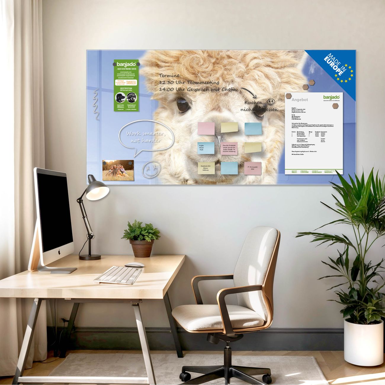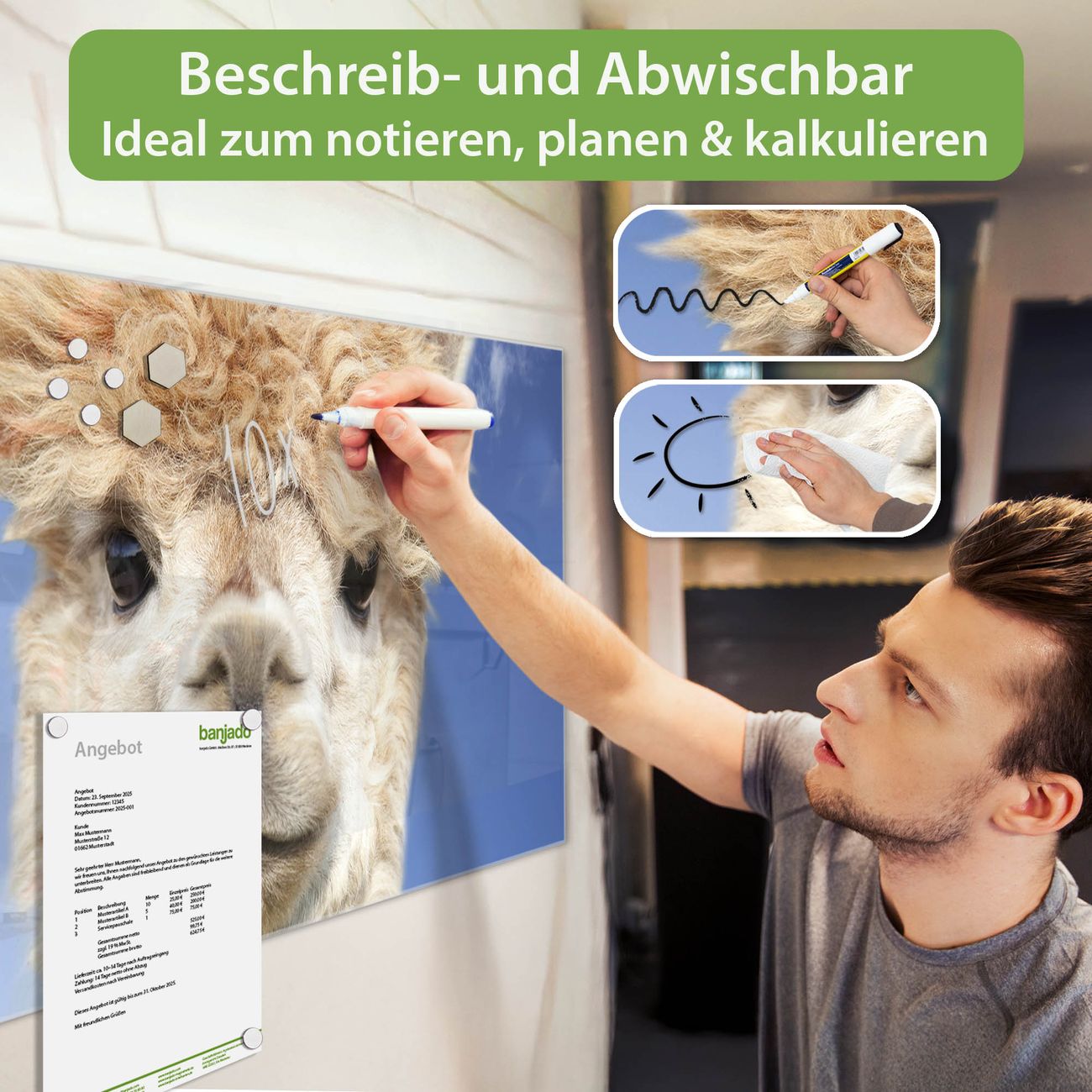 Jede Glas Magnettafel wird in unserer Werkstatt von Hand gefertigt und sorgfältig geprüft. So erhalten Sie ein echtes Qualitätsprodukt, das Funktion und Ästhetik perfekt vereint.?? Warum banjado?