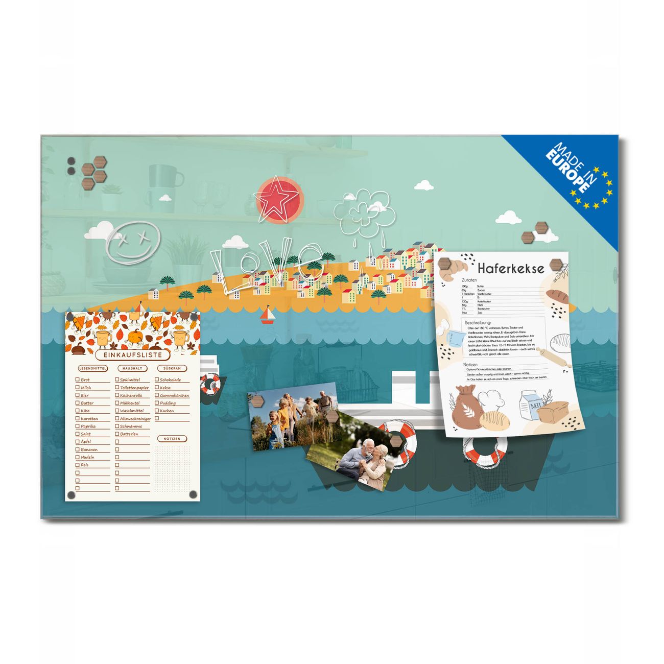 Ein Stück Design, das Ihren Alltag organisiert. Schreiben, heften, inspirieren - alles an einem Ort. Qualität, die man spürt. Montage leicht gemacht. Handwerk mit Herz - veredelt in Sachsen. Einzigartiges Design mit Motiv Motiv Land in Sicht Beschreibbare Glasoberfläche, leicht zu reinigen Starke Magnetkraft durch Stahlrückwand Inklusive 4 Neodym-Magneten Flexible Montageoptionen Handveredelt in Sachsen - Qualität, die bleibt