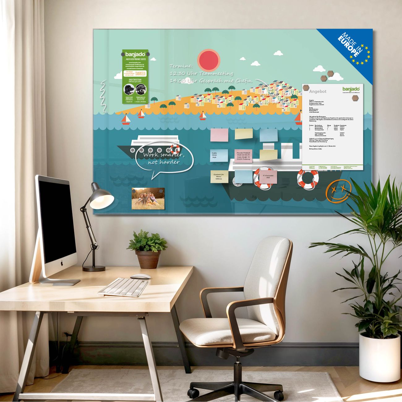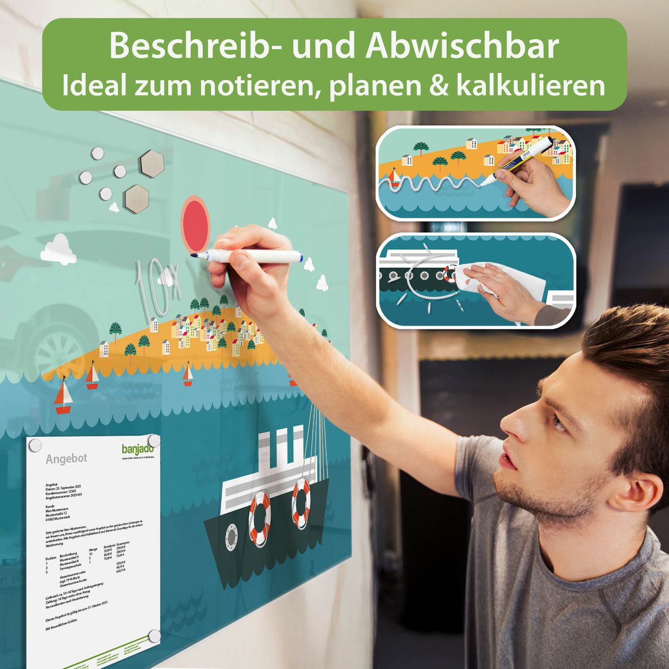 Jede Glas Magnettafel wird in unserer Werkstatt von Hand gefertigt und sorgfältig geprüft. So erhalten Sie ein echtes Qualitätsprodukt, das Funktion und Ästhetik perfekt vereint.?? Warum banjado?