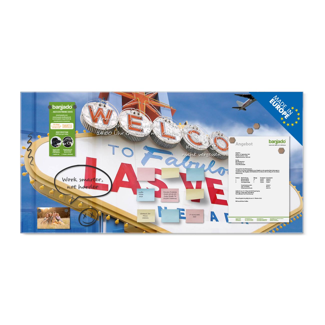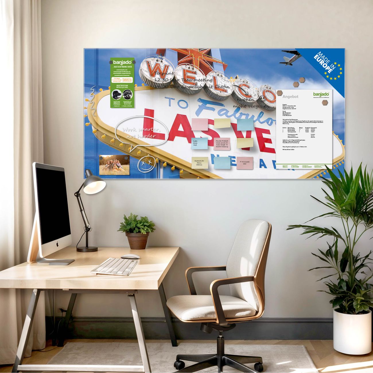 Jede Glas Magnettafel wird in unserer Werkstatt von Hand gefertigt und sorgfältig geprüft. So erhalten Sie ein echtes Qualitätsprodukt, das Funktion und Ästhetik perfekt vereint.?? Warum banjado?