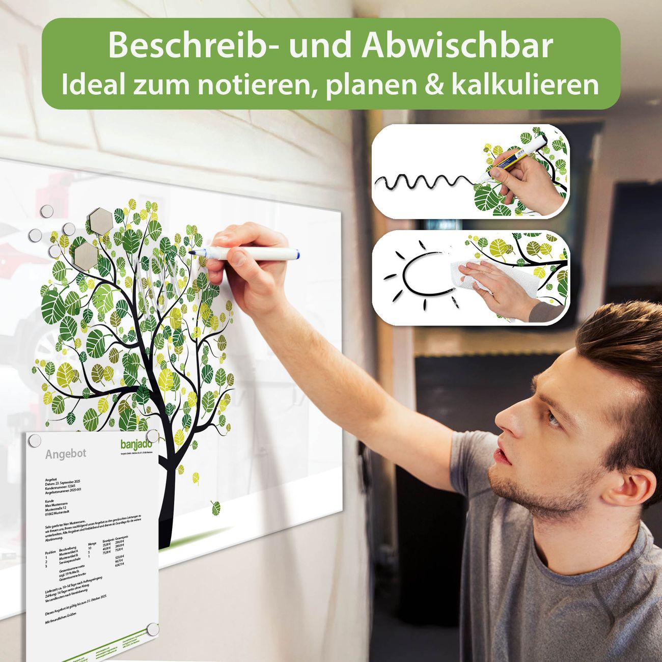 Jede Glas Magnettafel wird in unserer Werkstatt von Hand gefertigt und sorgfältig geprüft. So erhalten Sie ein echtes Qualitätsprodukt, das Funktion und Ästhetik perfekt vereint.?? Warum banjado?