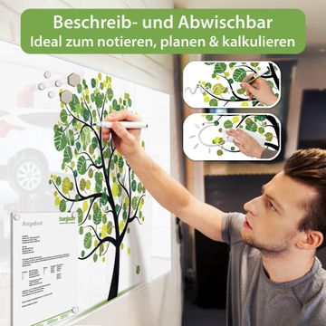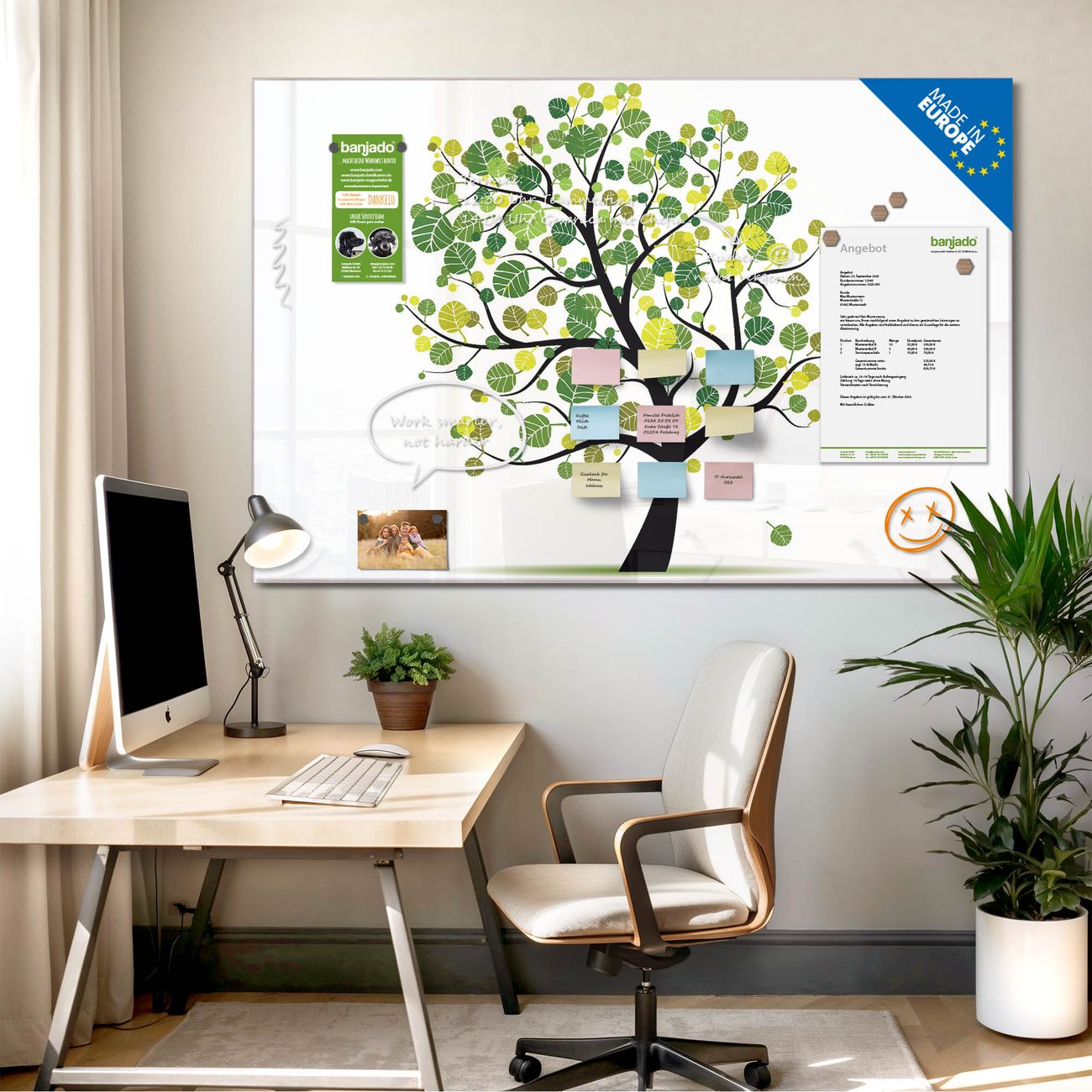 Die banjado Glas Magnettafel mit dem Motiv Motiv Laubzauberbaum verbindet Funktionalität mit Stil. Sie ersetzt das Zettelchaos durch klare Strukturen und bringt dabei eine warme, natürliche Atmosphäre in Ihr Zuhause. Ob im Büro, in der Küche oder im Eingangsbereich - dieses Design-Board zieht Blicke an und sorgt für Ordnung mit Charakter.