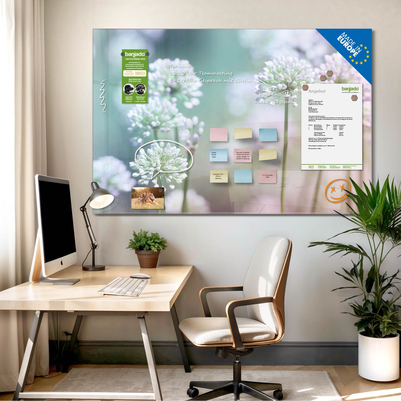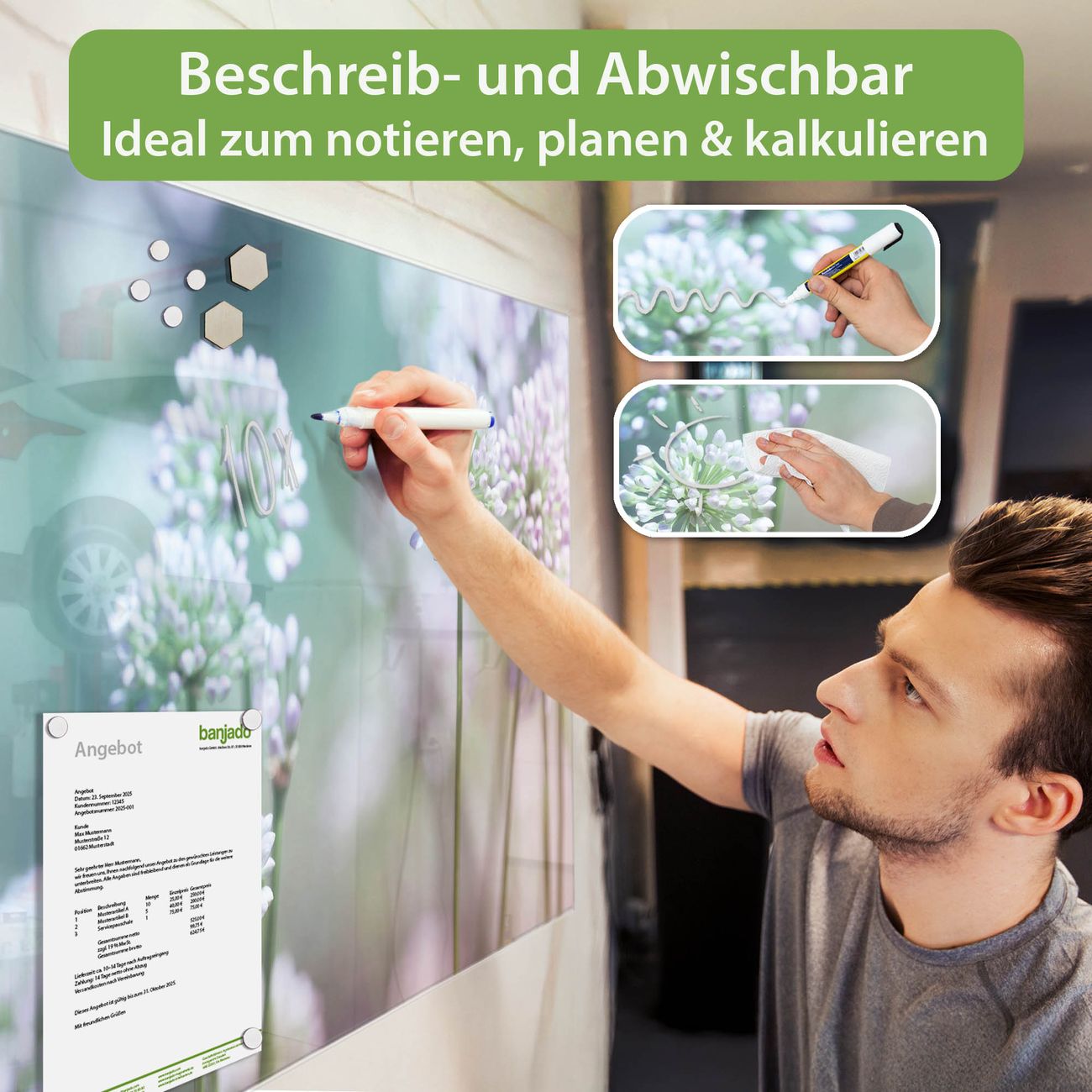 Die banjado Glas Magnettafel mit dem Motiv Motiv Lauchblüte verbindet Funktionalität mit Stil. Sie ersetzt das Zettelchaos durch klare Strukturen und bringt dabei eine warme, natürliche Atmosphäre in Ihr Zuhause. Ob im Büro, in der Küche oder im Eingangsbereich - dieses Design-Board zieht Blicke an und sorgt für Ordnung mit Charakter.