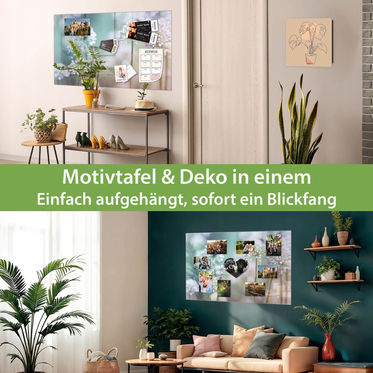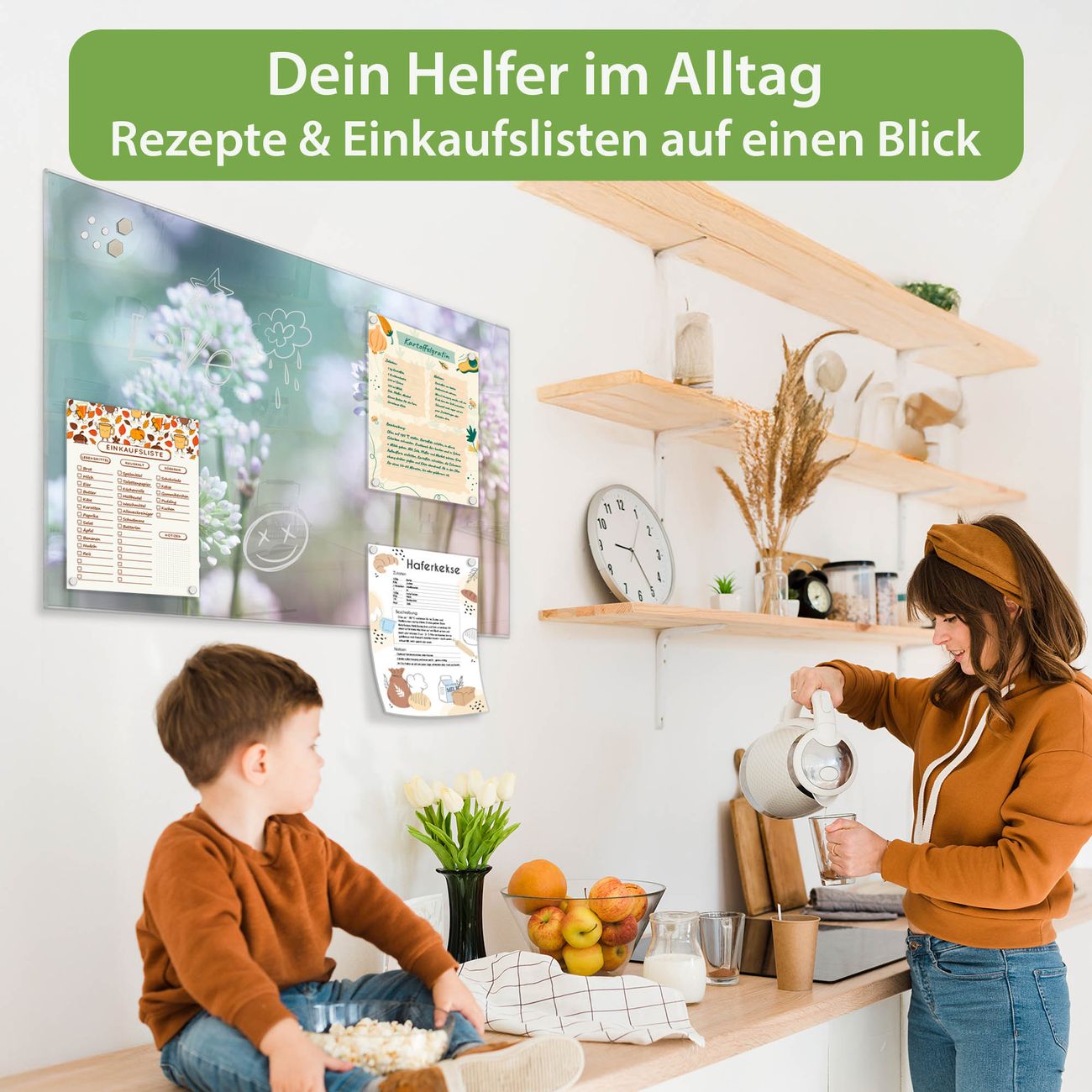 Auf der glatten Glasoberfläche lassen sich Termine, Rezepte oder Notizen ganz einfach mit Kreidestiften festhalten und rückstandslos entfernen. Starke Neodym-Magnete halten Ihre wichtigsten Erinnerungen sicher an Ort und Stelle. So entsteht Ihre ganz persönliche Ideenwand - jeden Tag neu.