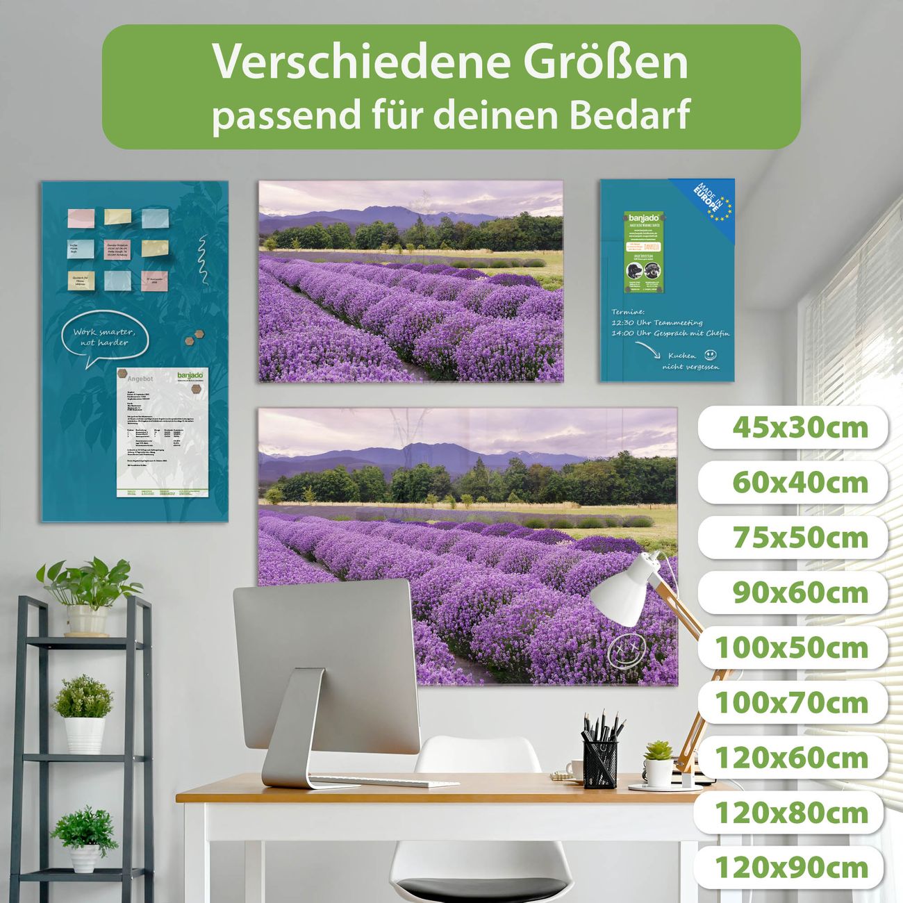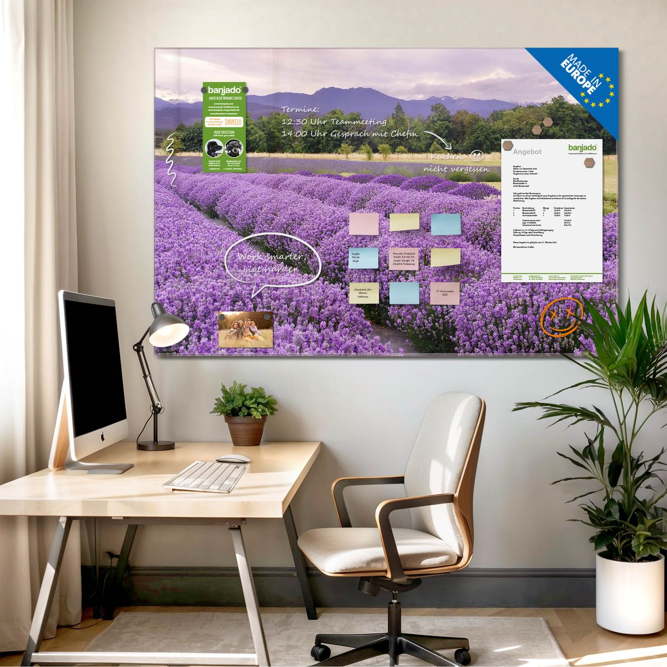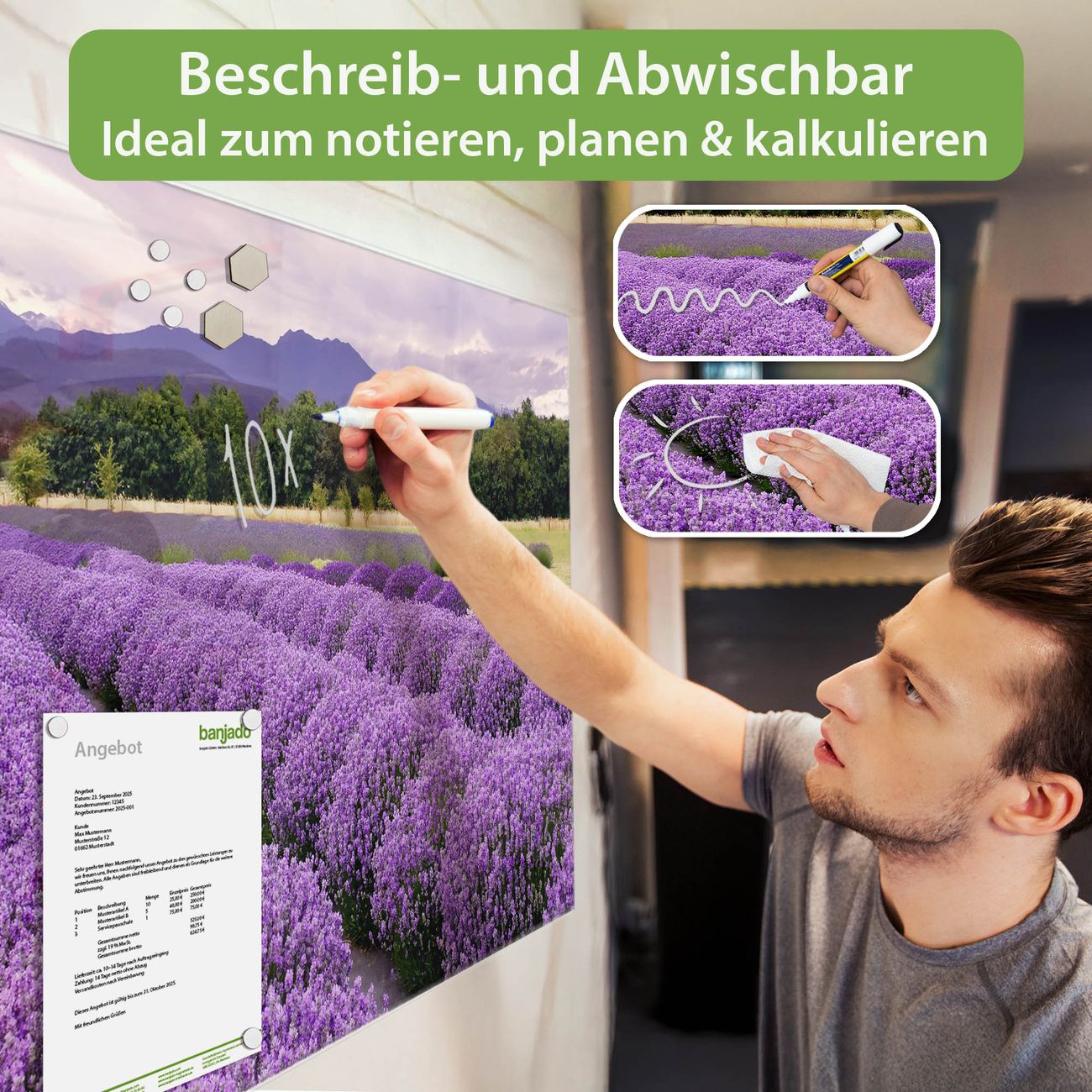 Jede Glas Magnettafel wird in unserer Werkstatt von Hand gefertigt und sorgfältig geprüft. So erhalten Sie ein echtes Qualitätsprodukt, das Funktion und Ästhetik perfekt vereint.?? Warum banjado?