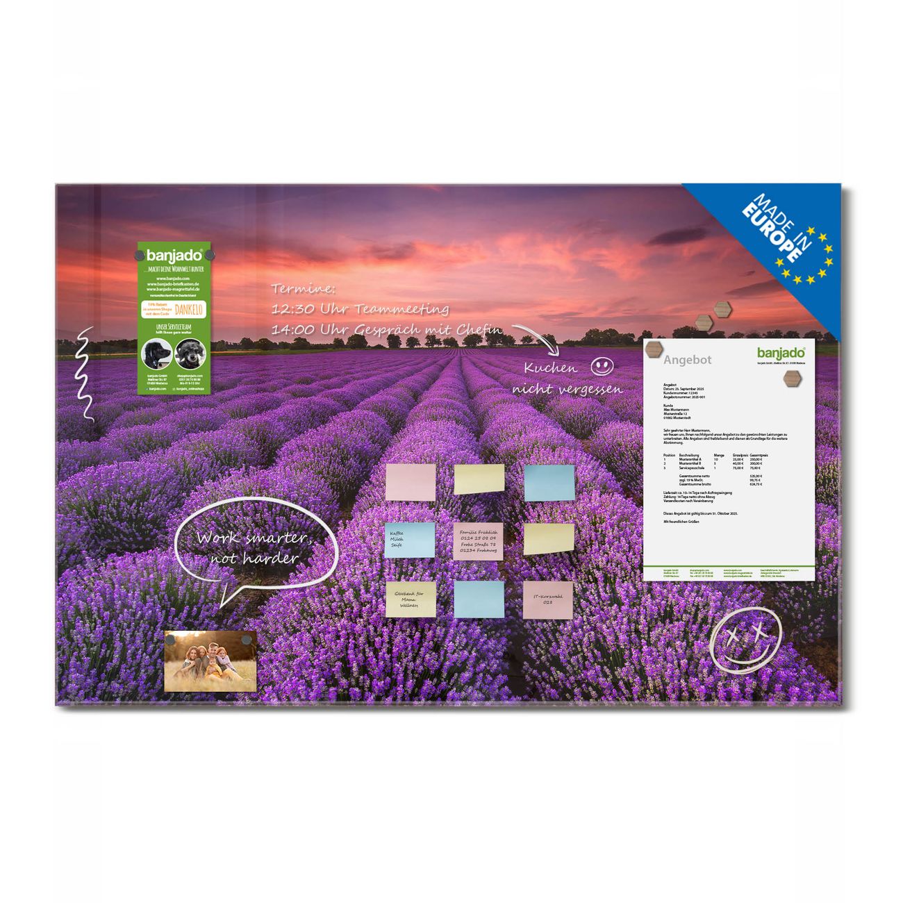 Ein Stück Design, das Ihren Alltag organisiert. Schreiben, heften, inspirieren - alles an einem Ort. Qualität, die man spürt. Montage leicht gemacht. Handwerk mit Herz - veredelt in Sachsen. Einzigartiges Design mit Motiv Motiv Lavendelfeld Beschreibbare Glasoberfläche, leicht zu reinigen Starke Magnetkraft durch Stahlrückwand Inklusive 4 Neodym-Magneten Flexible Montageoptionen Handveredelt in Sachsen - Qualität, die bleibt