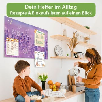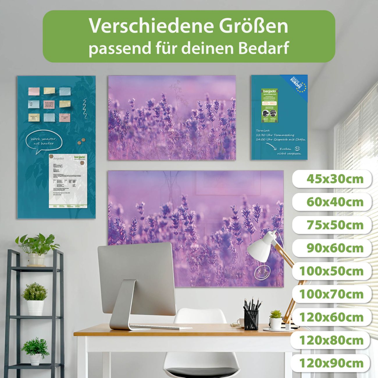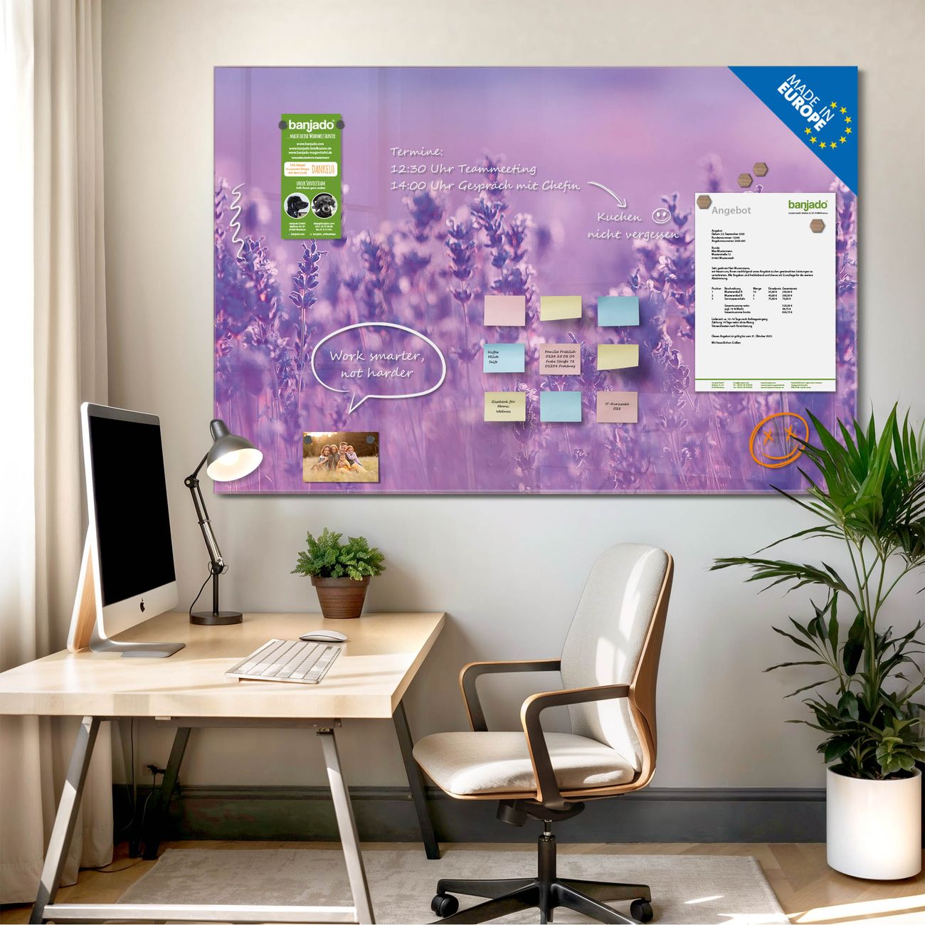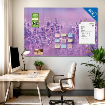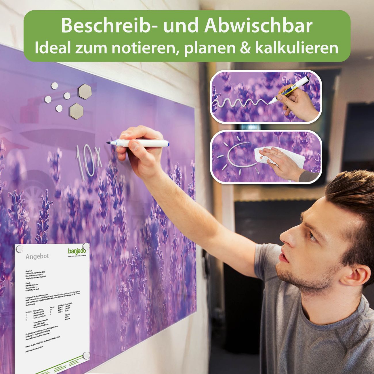 Die banjado Glas Magnettafel mit dem Motiv Motiv Lavendelmeer verbindet Funktionalität mit Stil. Sie ersetzt das Zettelchaos durch klare Strukturen und bringt dabei eine warme, natürliche Atmosphäre in Ihr Zuhause. Ob im Büro, in der Küche oder im Eingangsbereich - dieses Design-Board zieht Blicke an und sorgt für Ordnung mit Charakter.