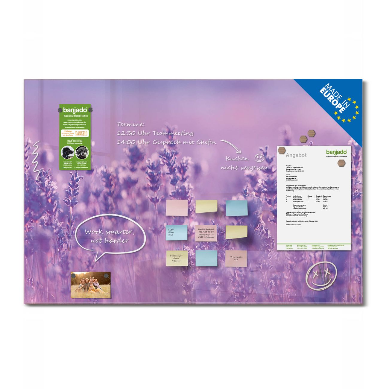 Die banjado Glas Magnettafel mit dem Motiv Motiv Lavendelmeer verbindet Funktionalität mit Stil. Sie ersetzt das Zettelchaos durch klare Strukturen und bringt dabei eine warme, natürliche Atmosphäre in Ihr Zuhause. Ob im Büro, in der Küche oder im Eingangsbereich - dieses Design-Board zieht Blicke an und sorgt für Ordnung mit Charakter.