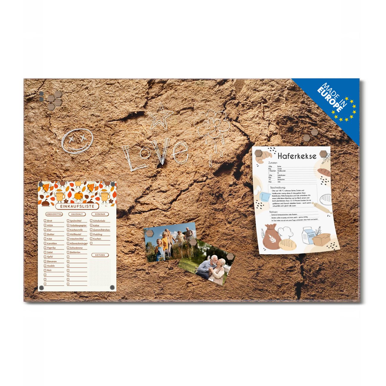 Ein Stück Design, das Ihren Alltag organisiert. Schreiben, heften, inspirieren - alles an einem Ort. Qualität, die man spürt. Montage leicht gemacht. Handwerk mit Herz - veredelt in Sachsen. Einzigartiges Design mit Motiv Motiv Lehmboden Beschreibbare Glasoberfläche, leicht zu reinigen Starke Magnetkraft durch Stahlrückwand Inklusive 4 Neodym-Magneten Flexible Montageoptionen Handveredelt in Sachsen - Qualität, die bleibt