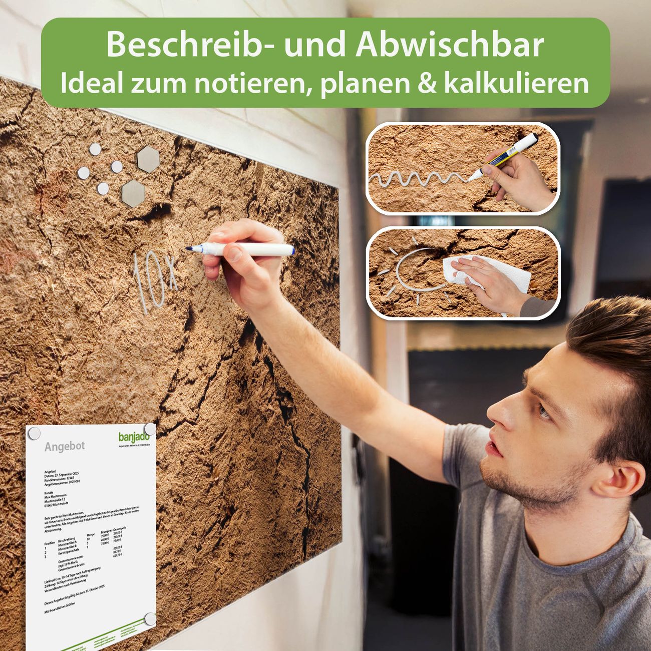 Jede Glas Magnettafel wird in unserer Werkstatt von Hand gefertigt und sorgfältig geprüft. So erhalten Sie ein echtes Qualitätsprodukt, das Funktion und Ästhetik perfekt vereint.?? Warum banjado?